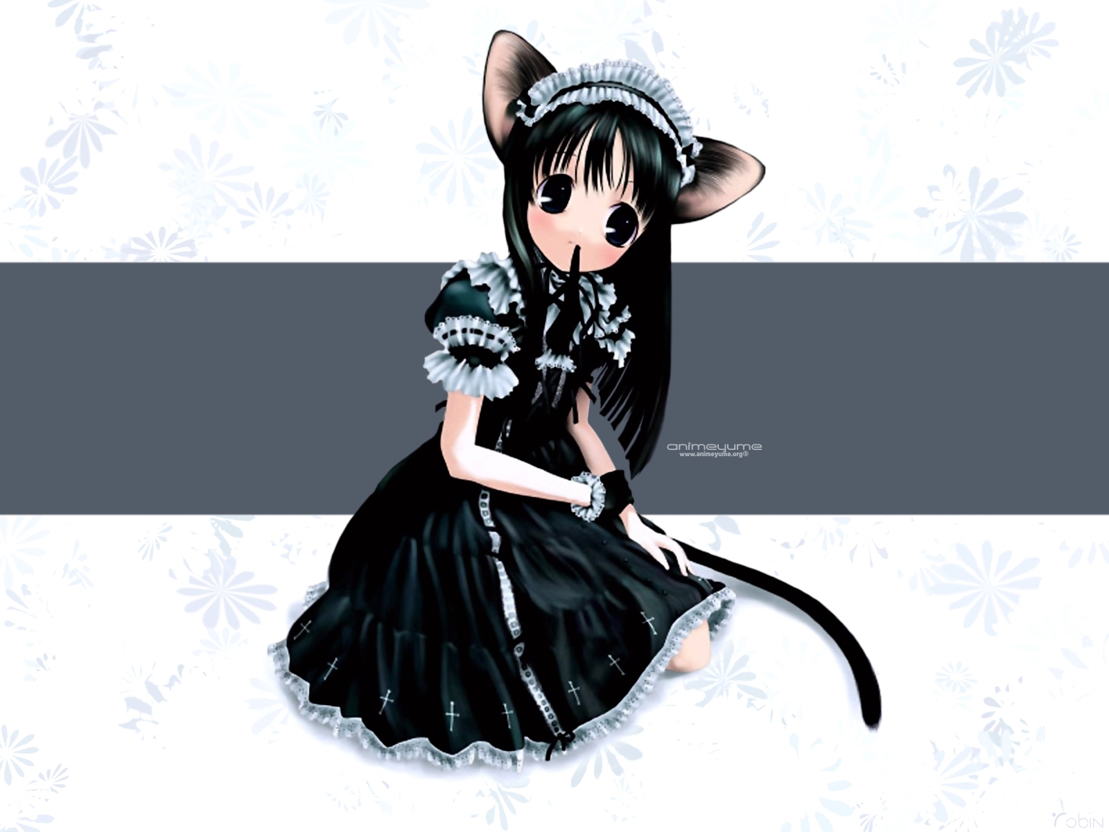 Description: A cartoon character with a cat on her head and a dress on her body.
