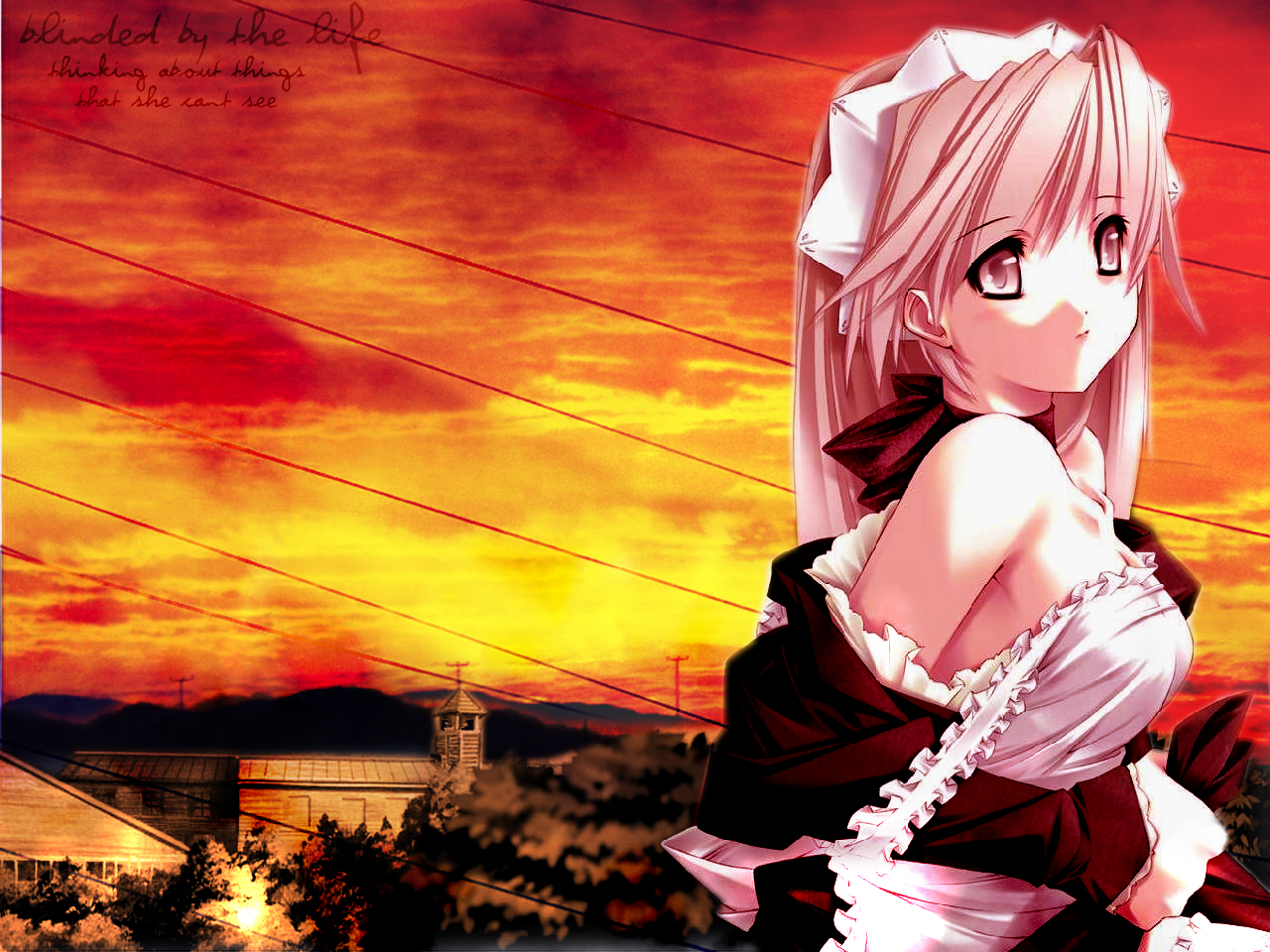 Description: A woman in a dress standing in front of a sunset with a red sky behind her and a red and yellow sky.