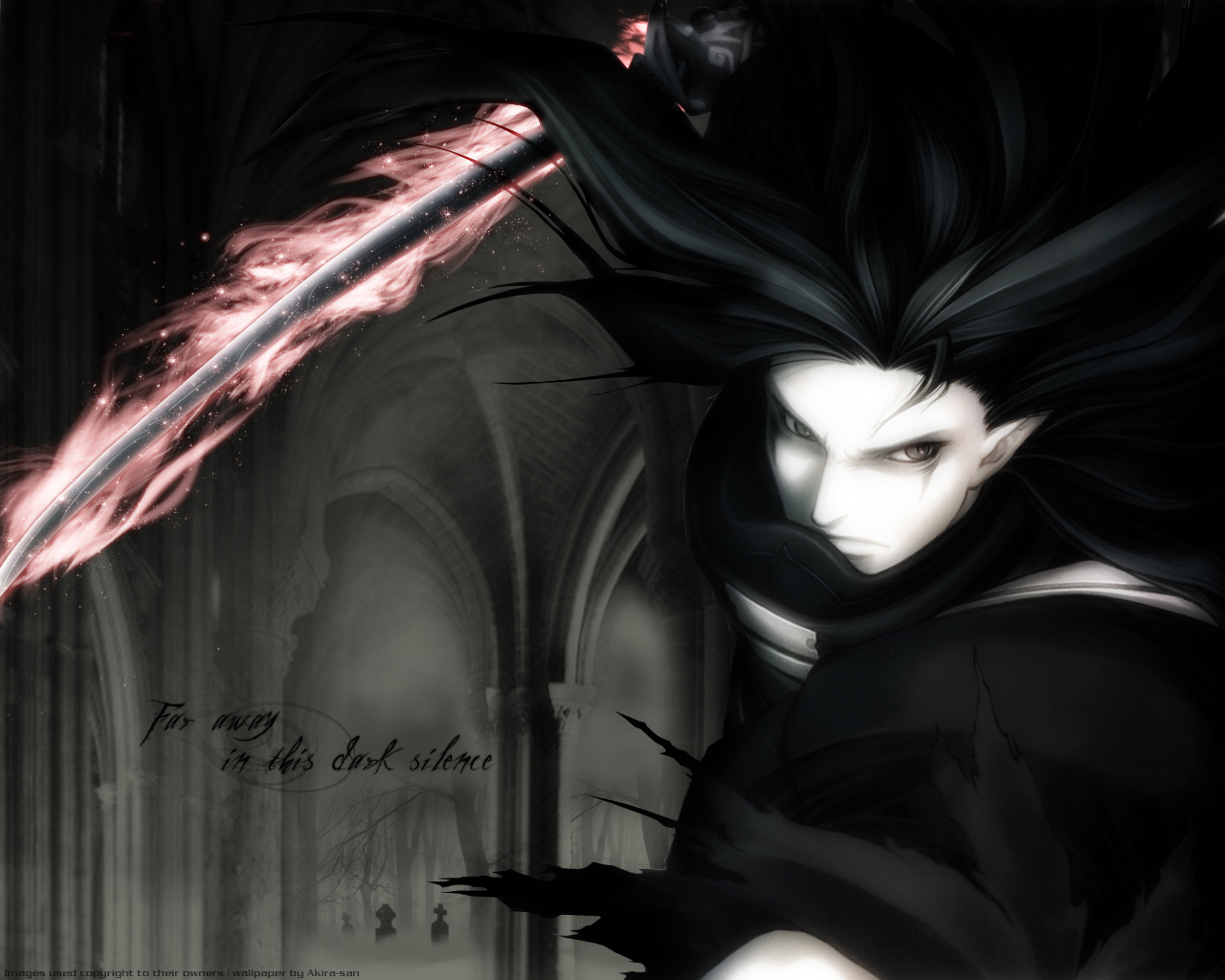 Description: A man with a sword in his hand and a demon on his shoulder.