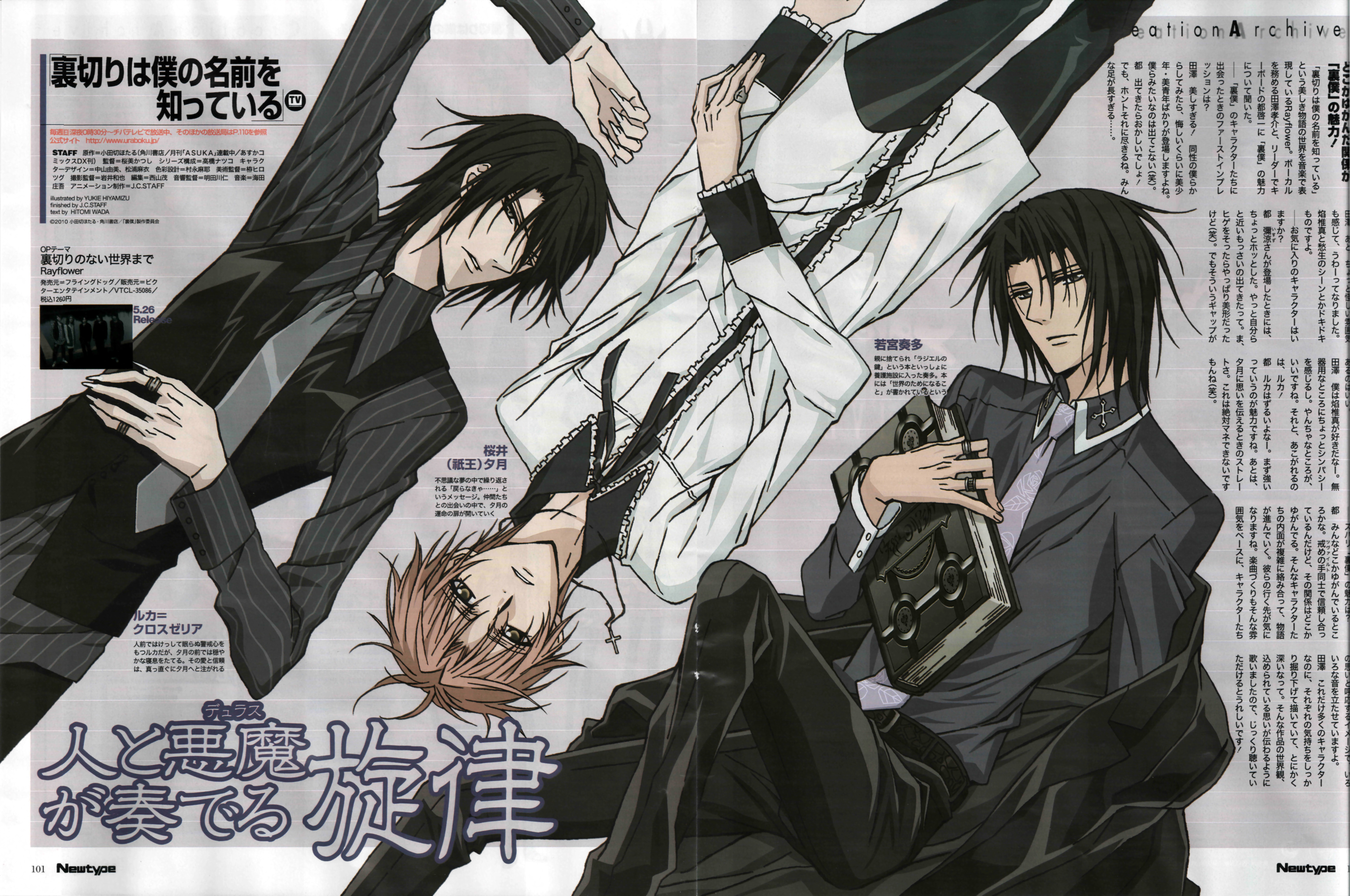 Description: A newspaper with a man and woman in black clothes and a cat on the floor and a cat in the other hand.