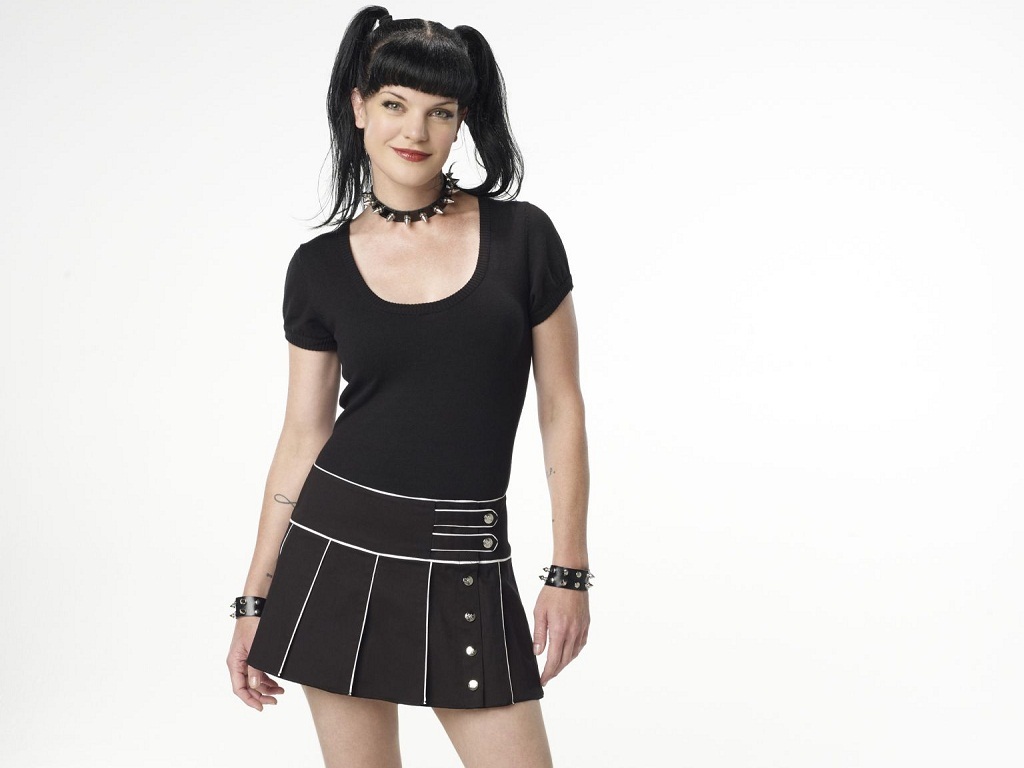 Description: A woman in a black dress with a black and white skirt and a black necklace and a black and white shirt.