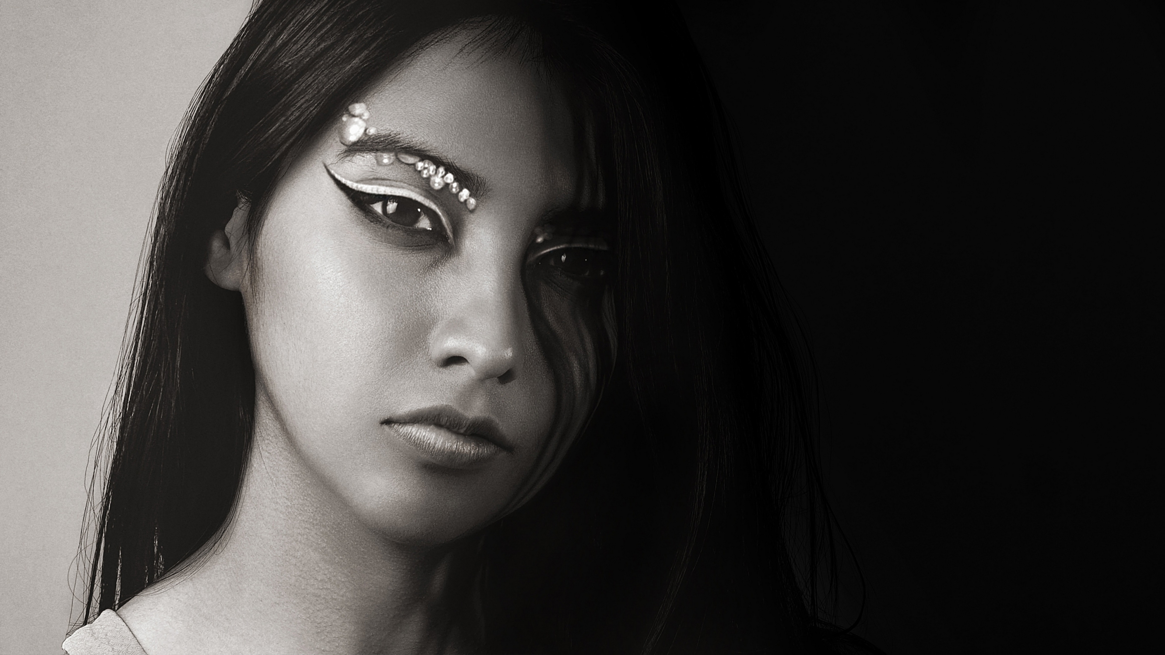 Description: A woman with a fake eyeliner and a fake nose ring on her head.