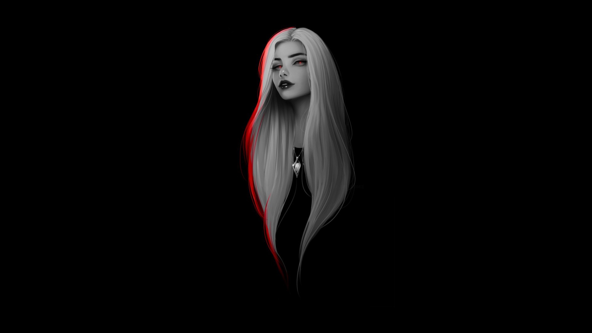 Description: A woman with long hair and a black dress with red trims is looking down at the camera with a black background.
