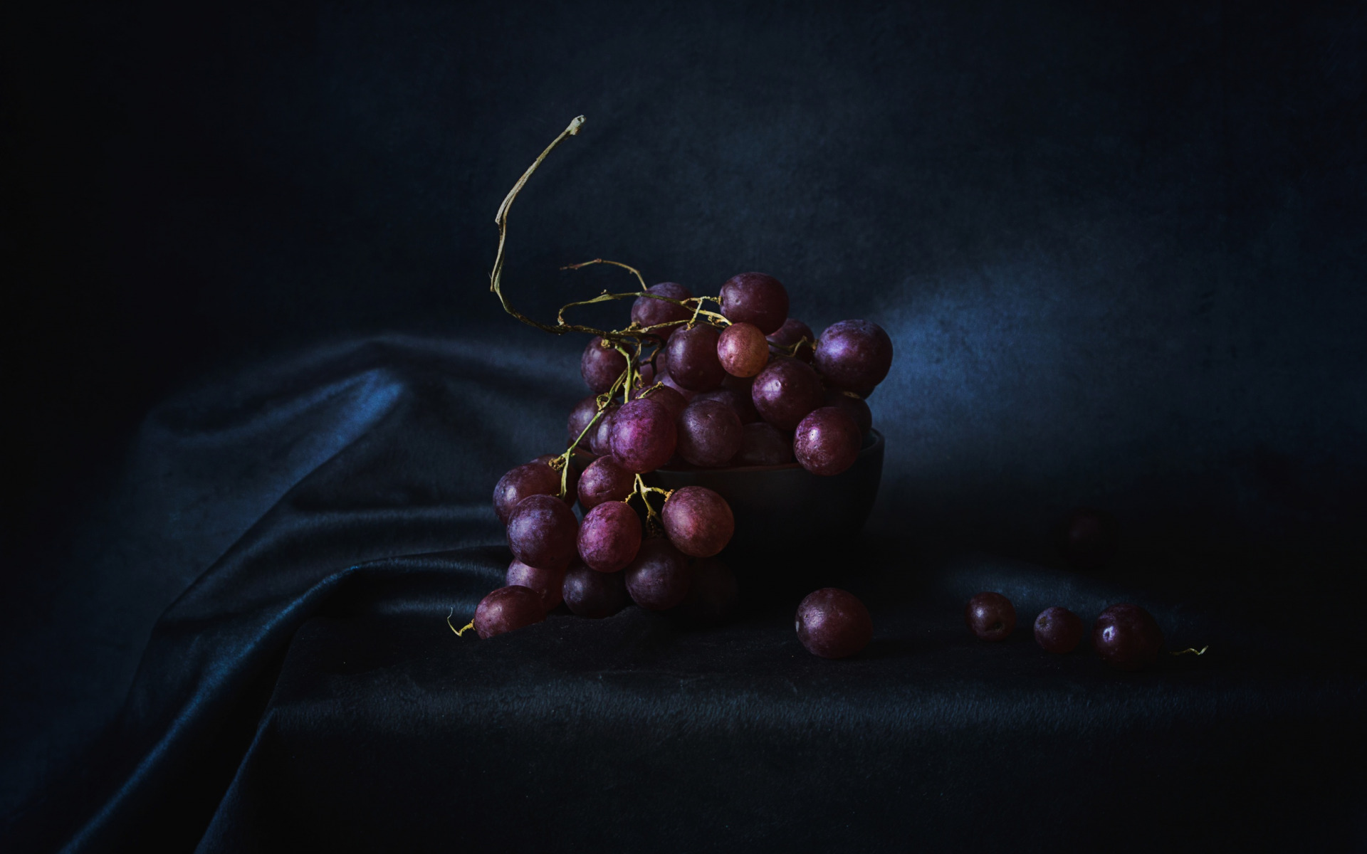 Description: A bunch of grapes sitting in a bowl on a tableclothed tableclothed tableclothed table.