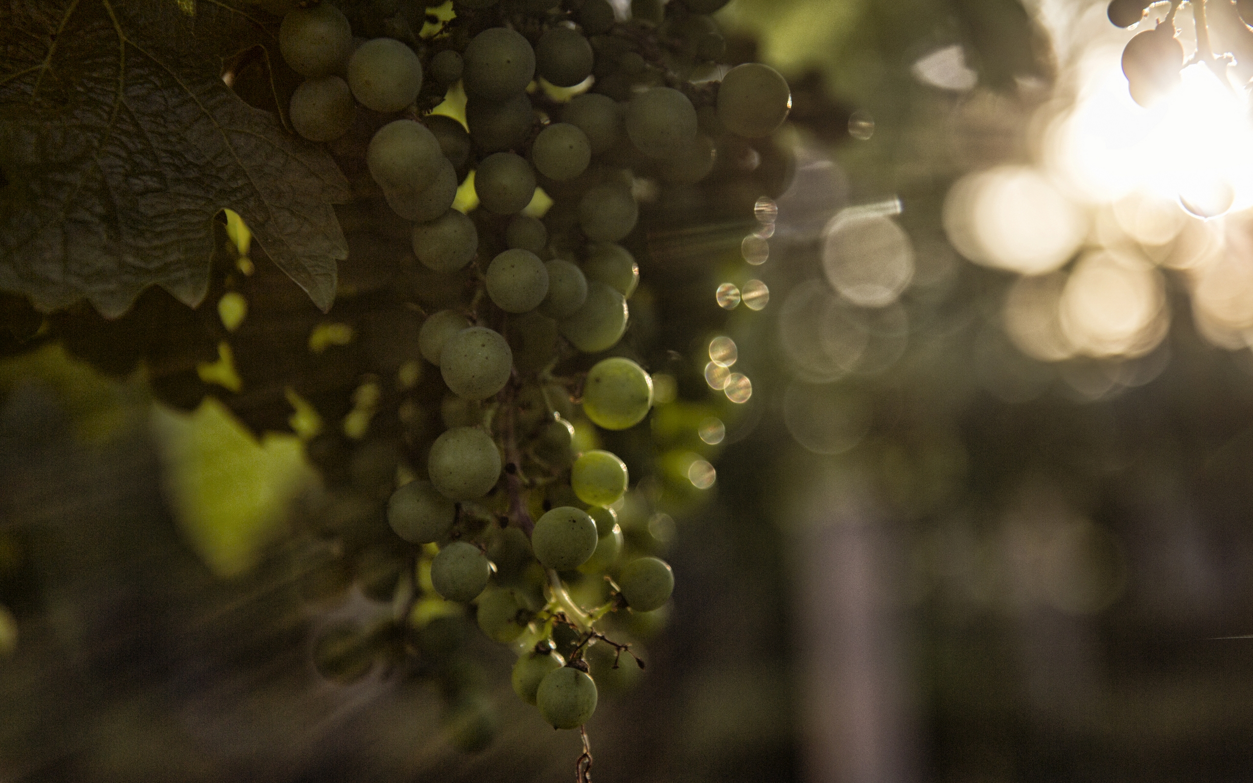 Description: A bunch of grapes hanging from a tree branch with the sun shining through the leaves on the branches behind them.