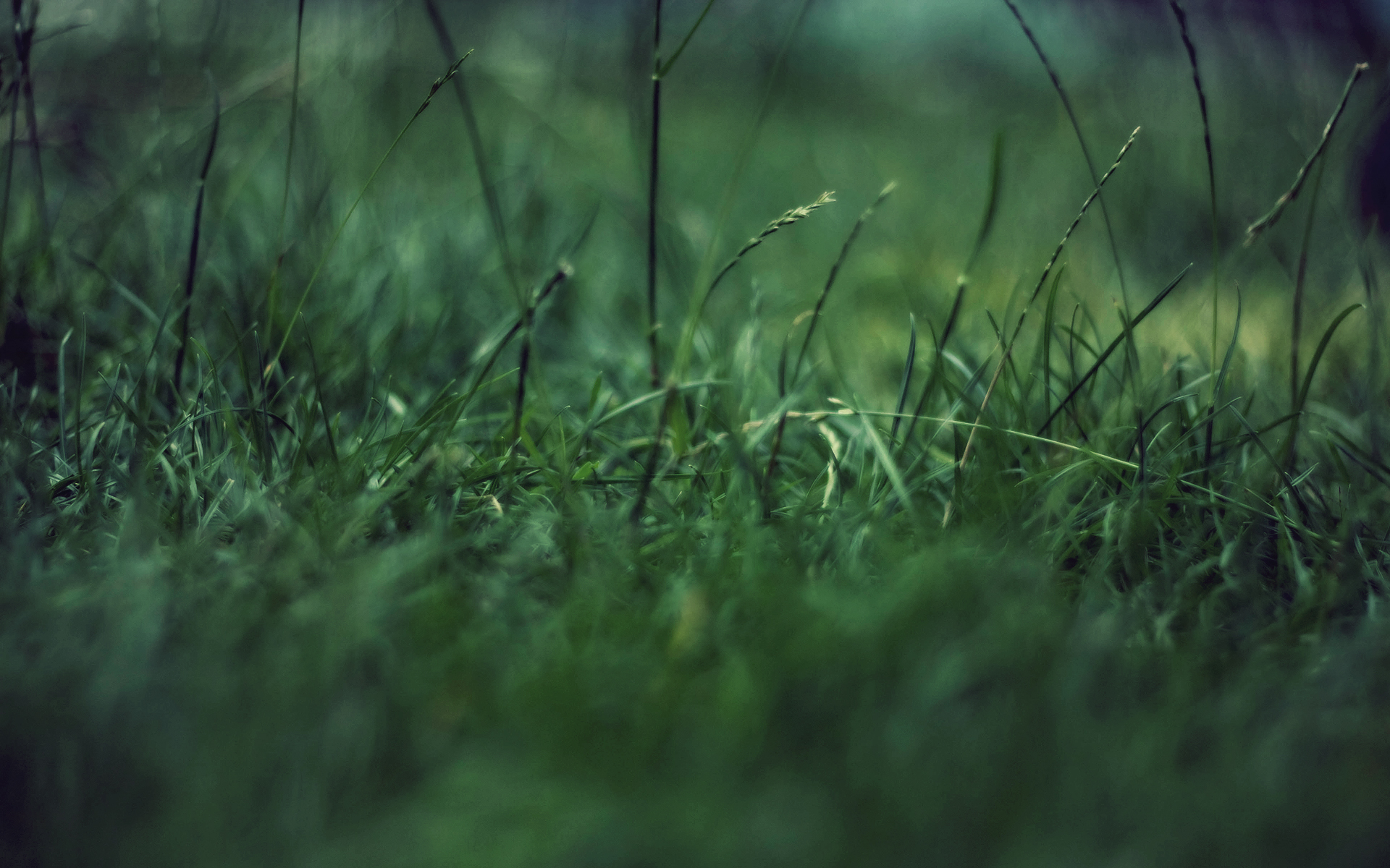 Description: A close up of a grass field with a blurry background of grass and weeds in the foreground.