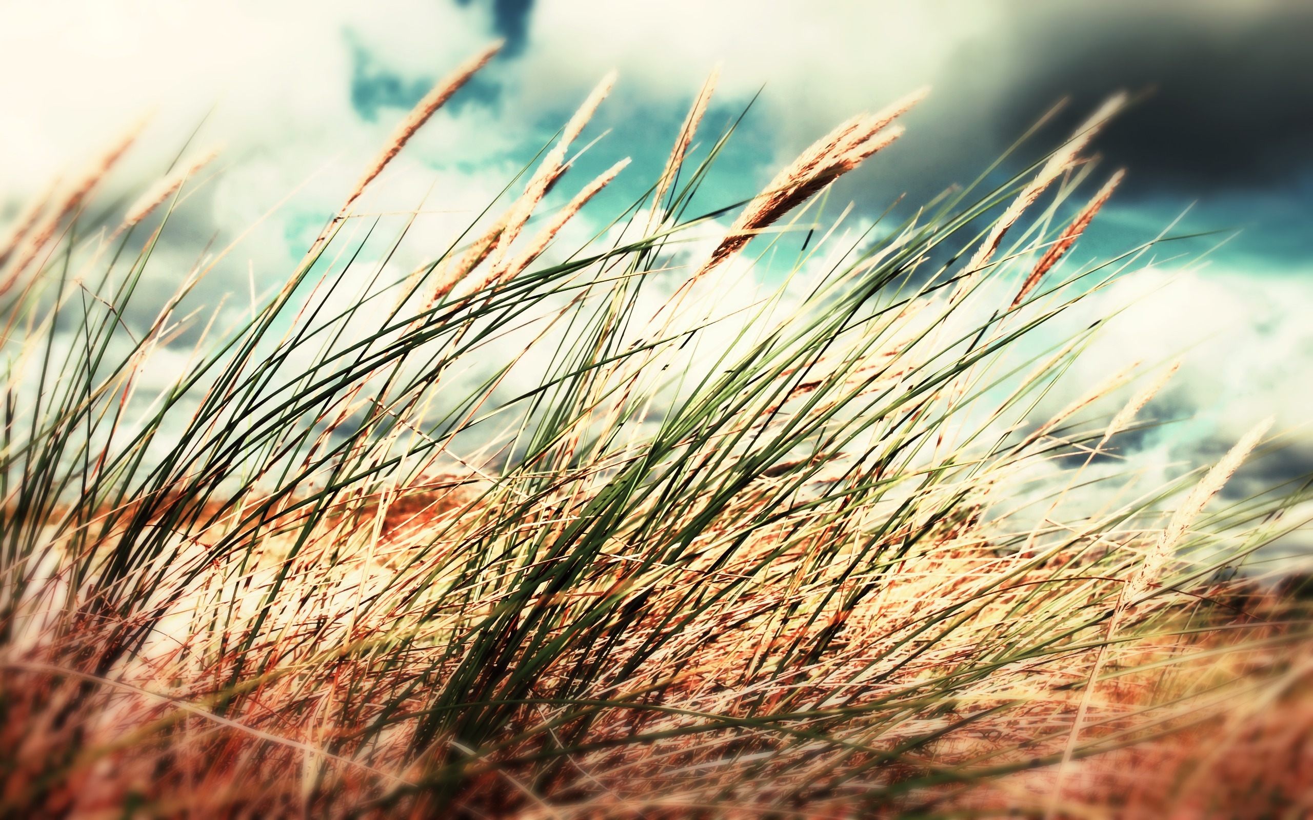 Description: A close up of a grass with clouds in the background and a bird flying in the sky above it.