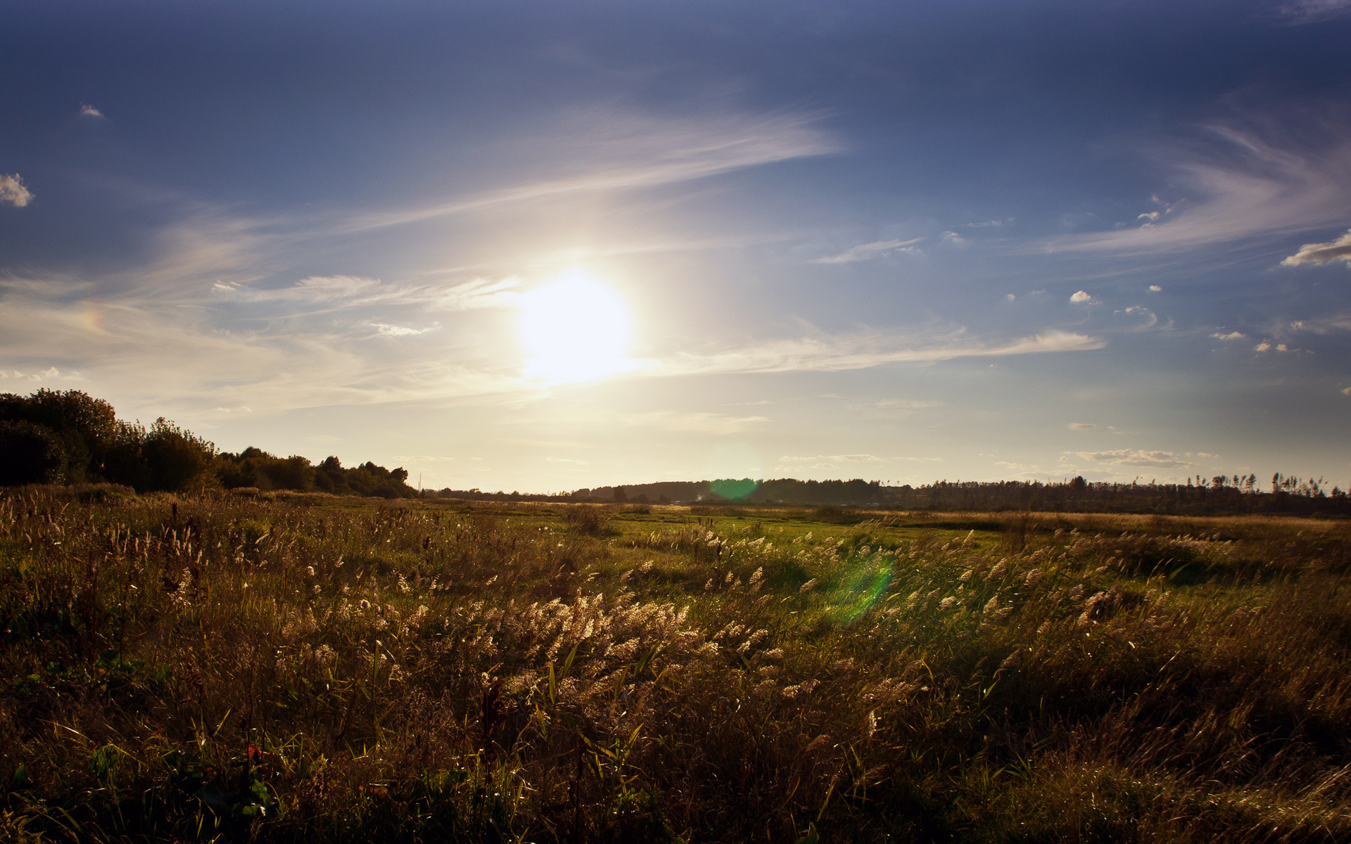 Description: A field with grass and trees under a blue sky with the sun shining through the clouds and the sun shining through the clouds.