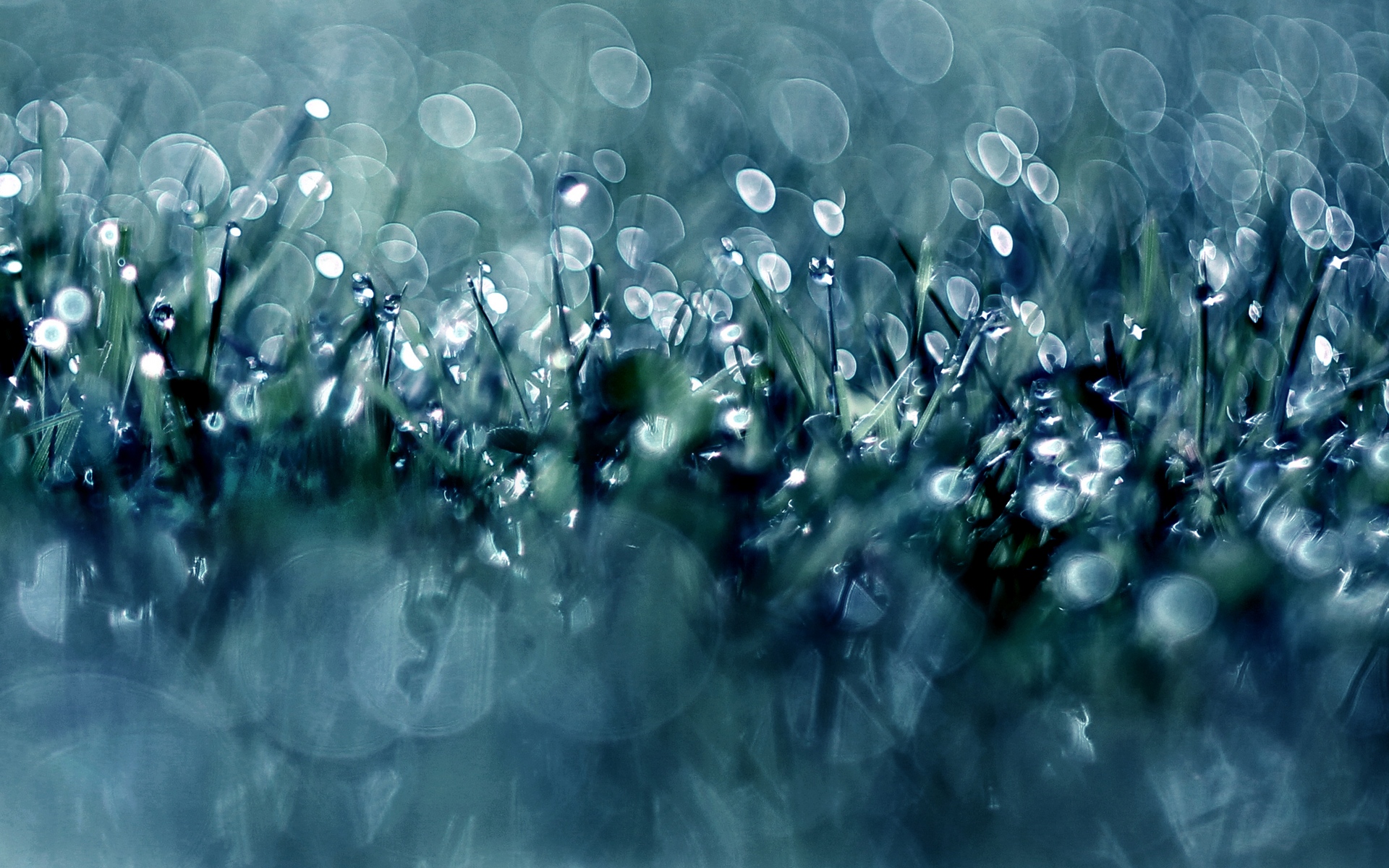 Description: A close up of a grass with water drops on it and a blurry background of grass with water drops on it.