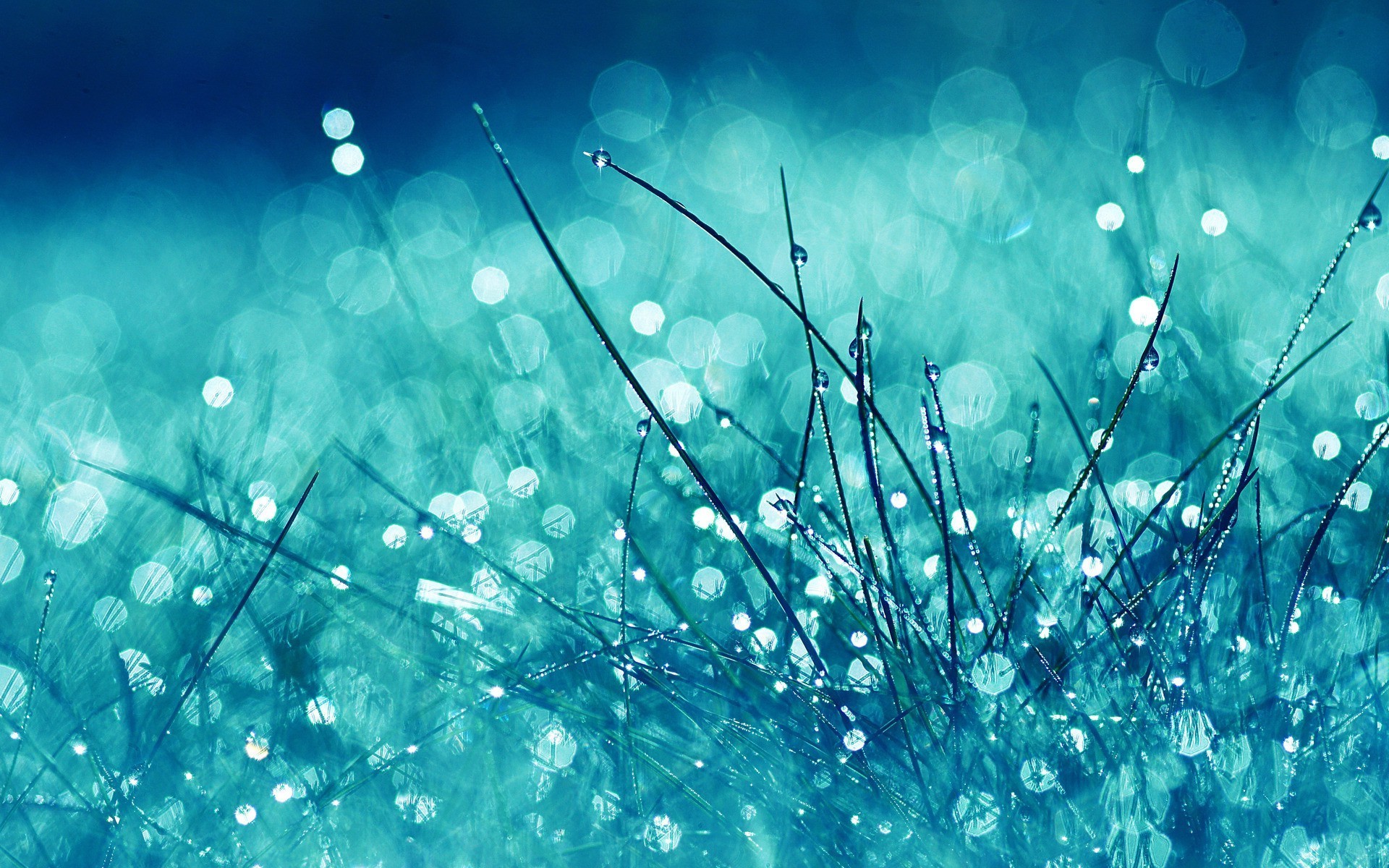 Description: A close up of a grass with water drops on it and a blue background with a blurry background.