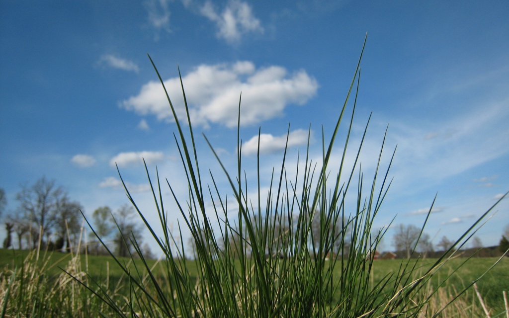 Description: A grassy field with a blue sky and clouds in the background with a few clouds in the sky above.