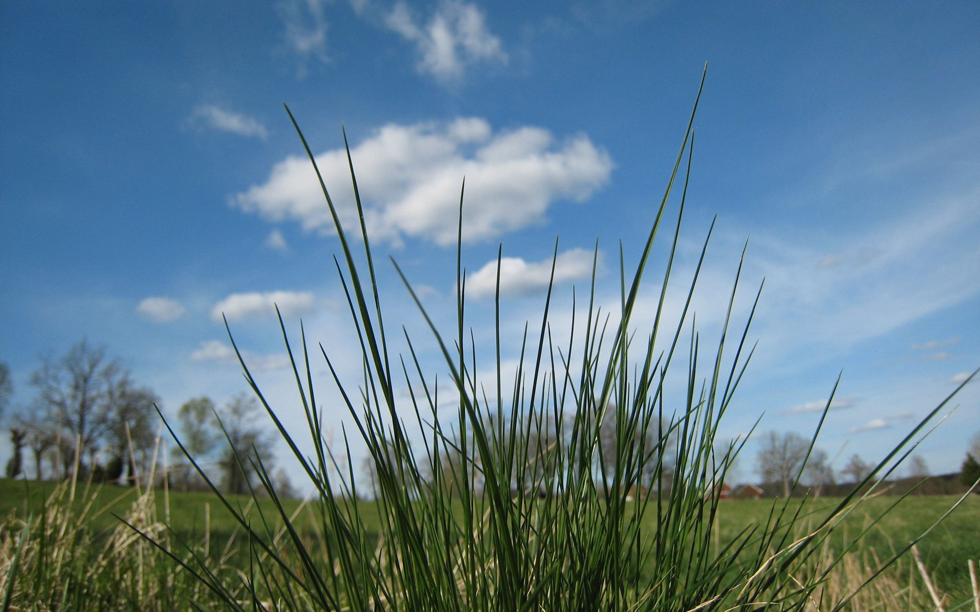 Description: A grassy field with a blue sky and clouds in the background with a few clouds in the sky above.