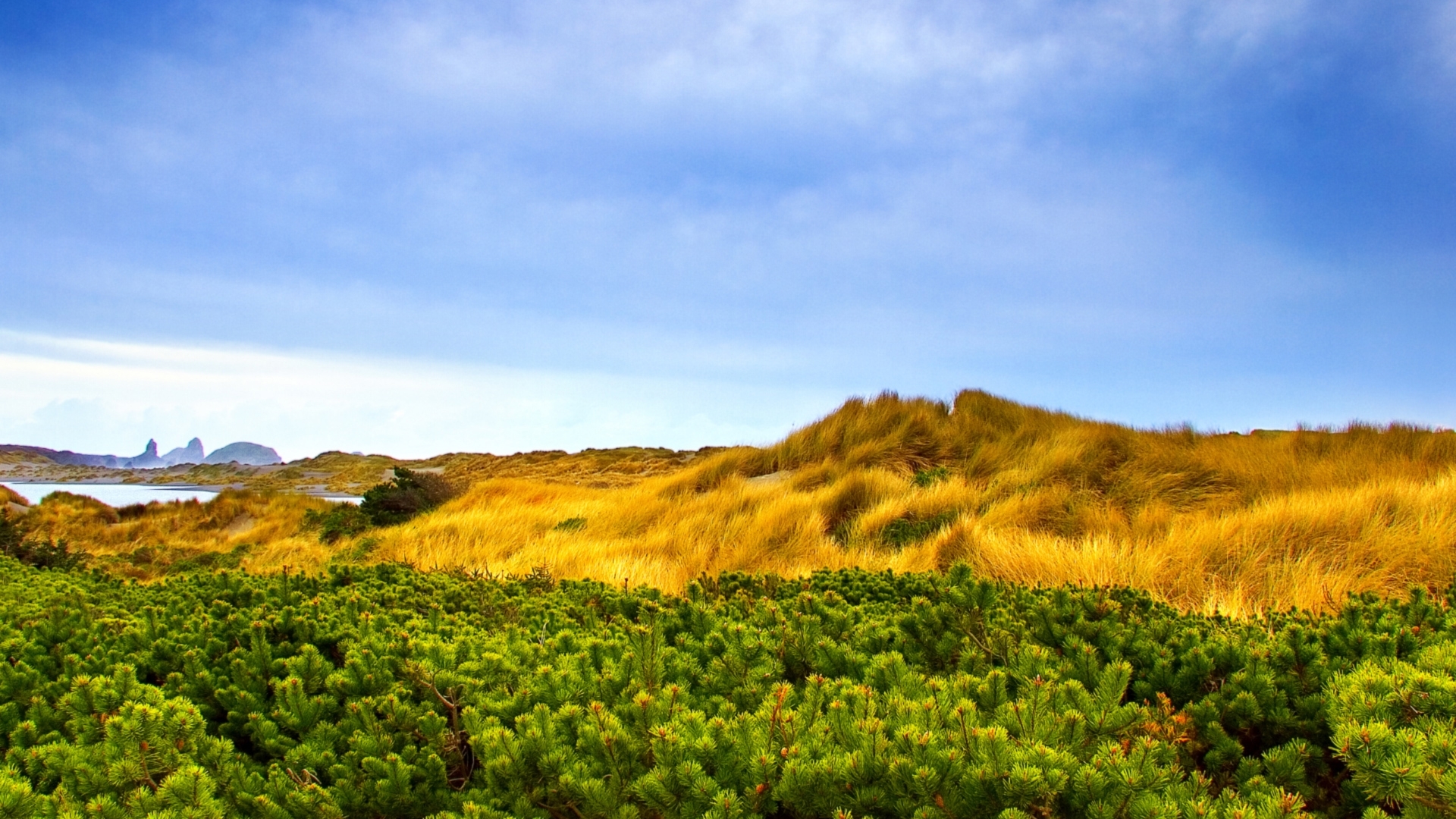Description: A grassy field with a mountain in the background and a body of water in the distance with a blue sky.
