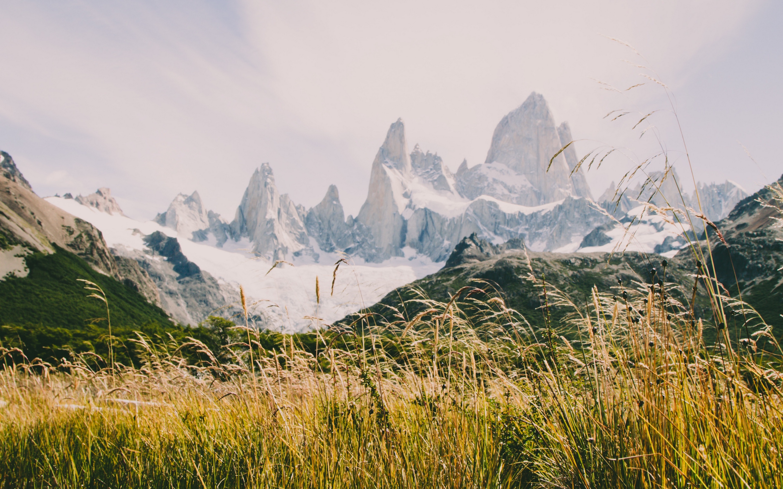 Description: A grassy field with tall grass and mountains in the background with clouds in the sky above it and a few snow capped mountains in the distance.