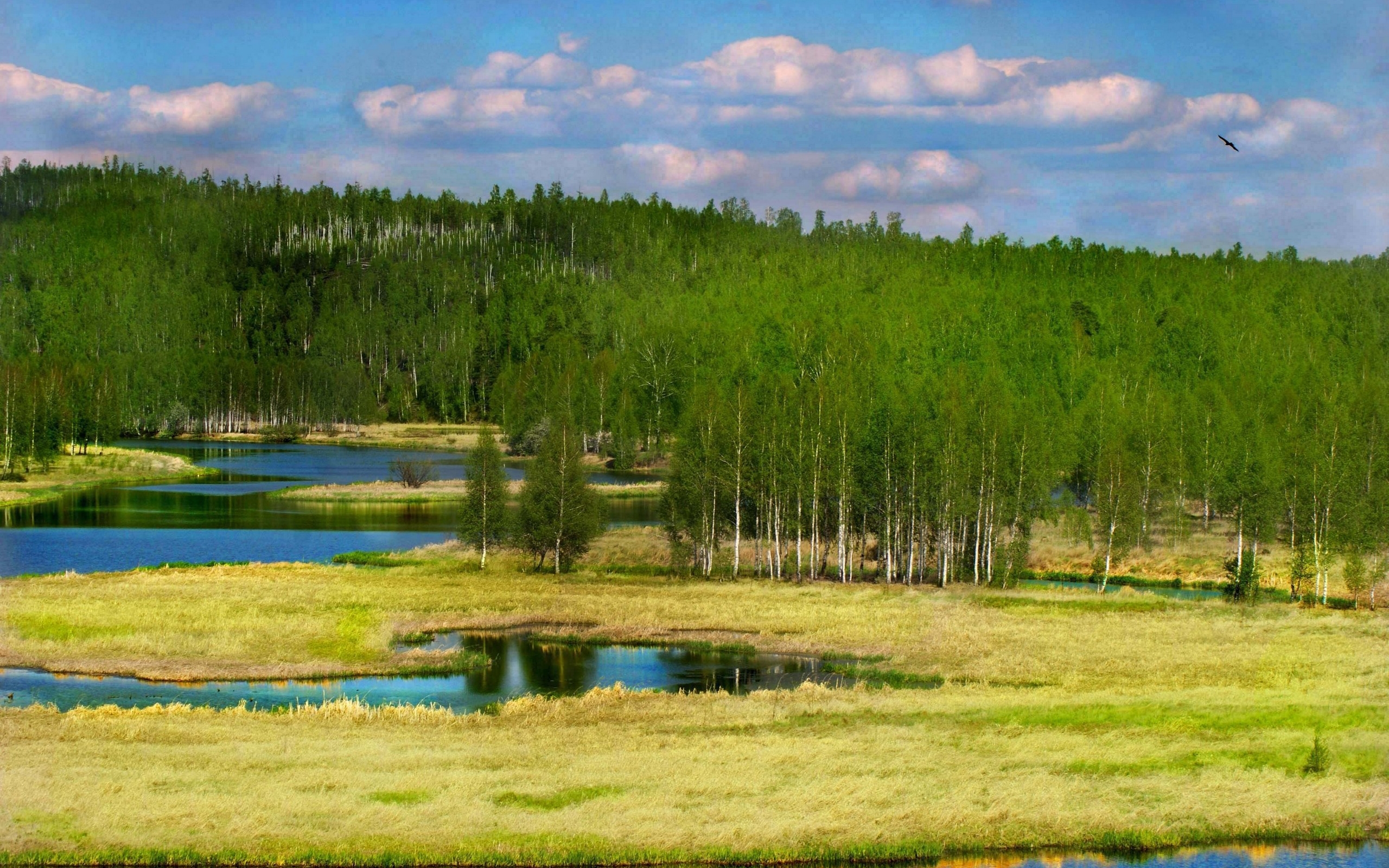 Description: A grassy field with a pond and trees in the background and a bird flying over the water in the distance.