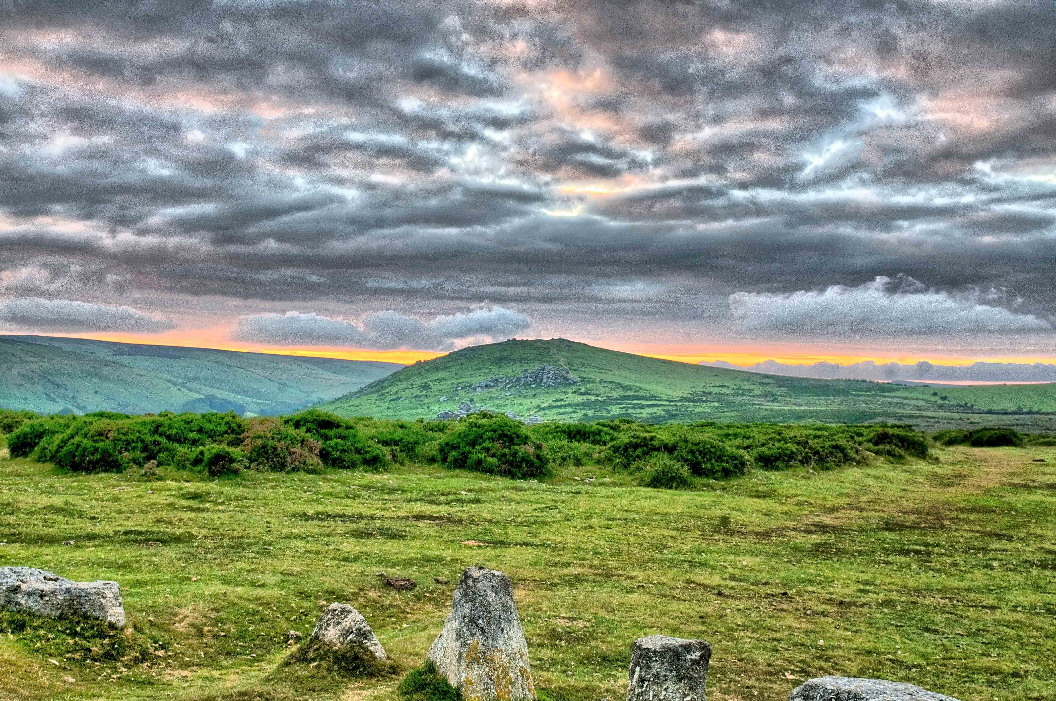 Description: A grassy field with rocks and a mountain in the background with a cloudy sky above it and a few green trees.