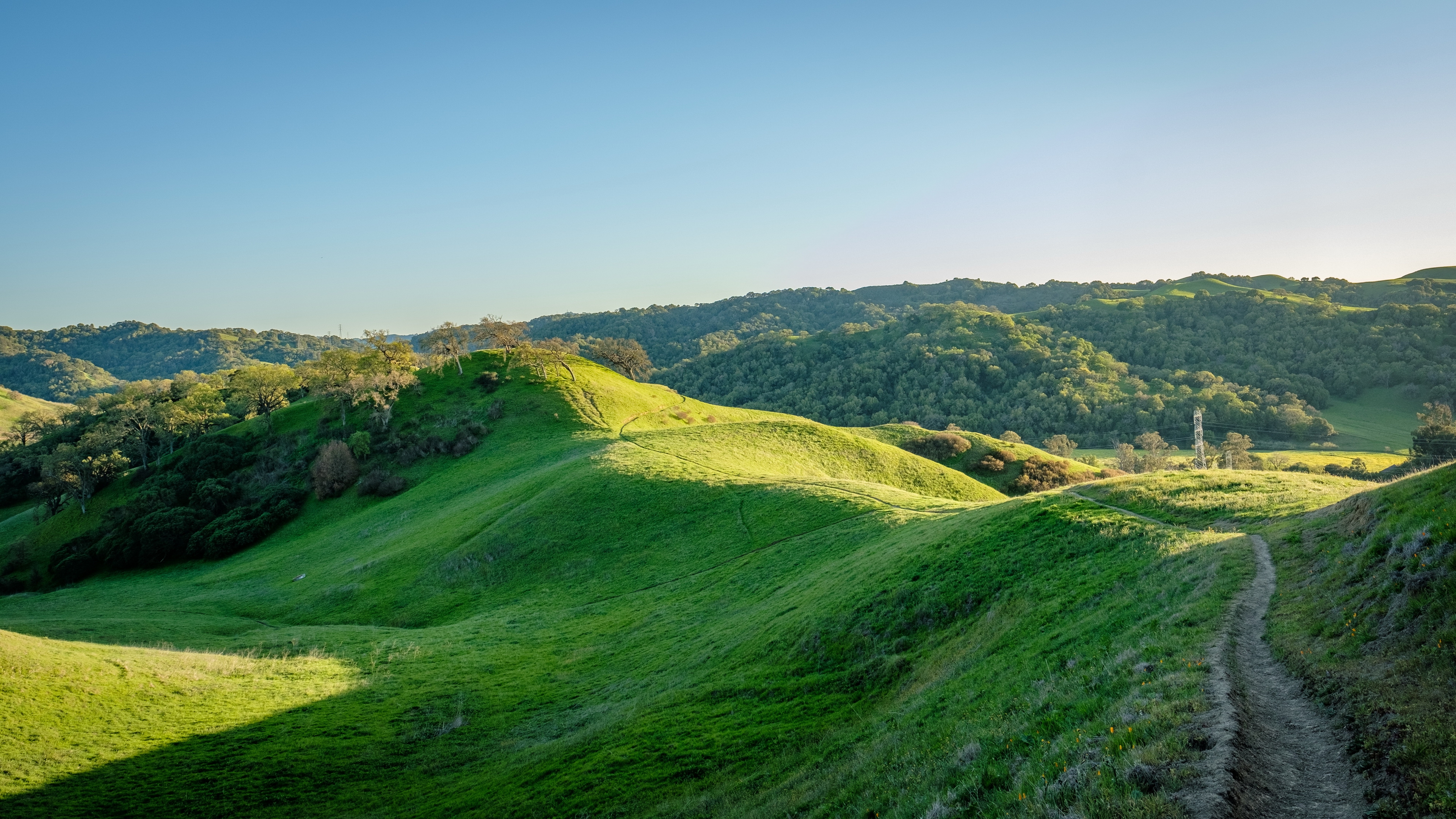 Description: A grassy hill with a dirt path going up it's side and a forest in the background with a blue sky.