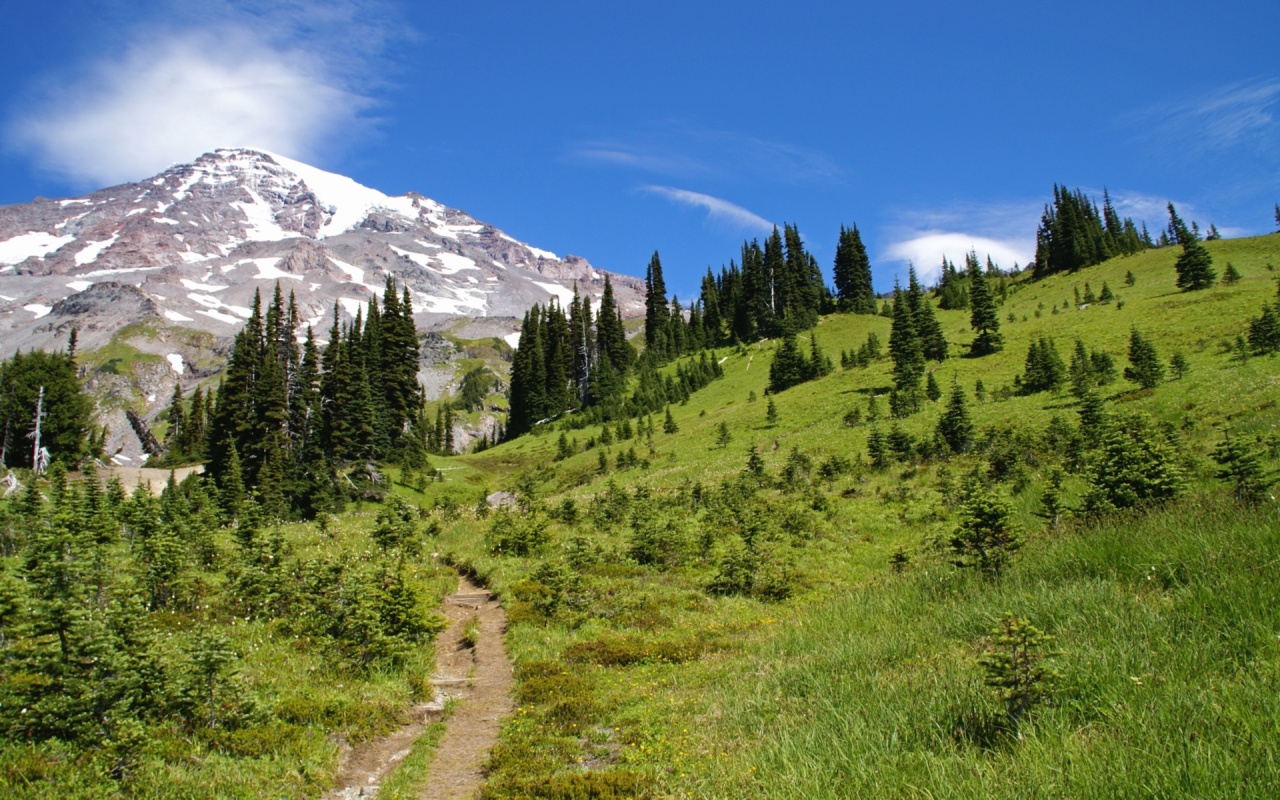 Description: A trail winds through a grassy meadow with a mountain in the background and trees on the side of the path.