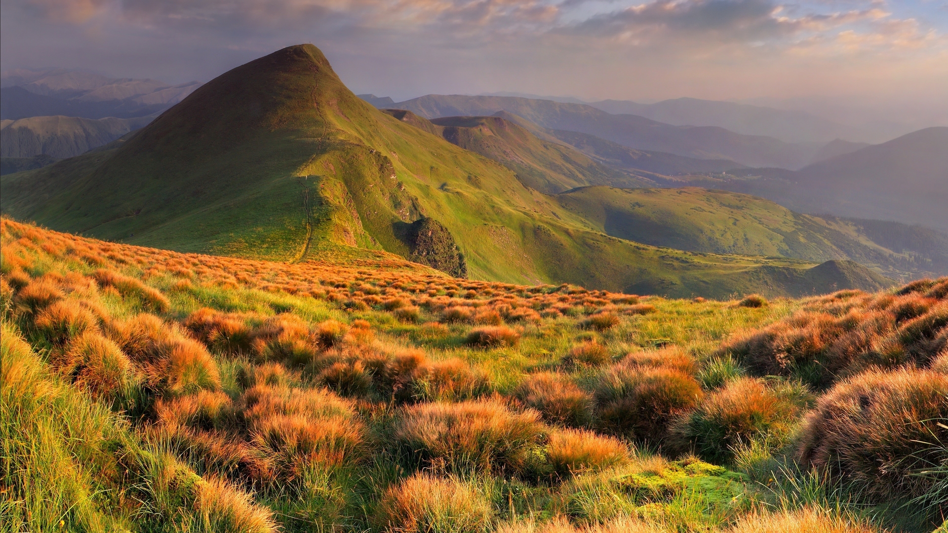 Description: A grassy field with a mountain in the background and a cloudy sky above it with a few clouds in the sky.