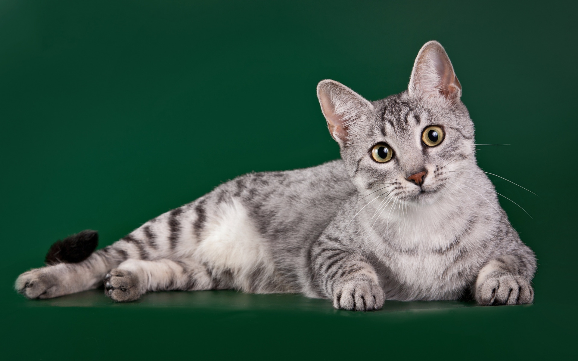 Description: A gray and white cat laying down on a green background with a black spot on its face and a black spot on its chest.