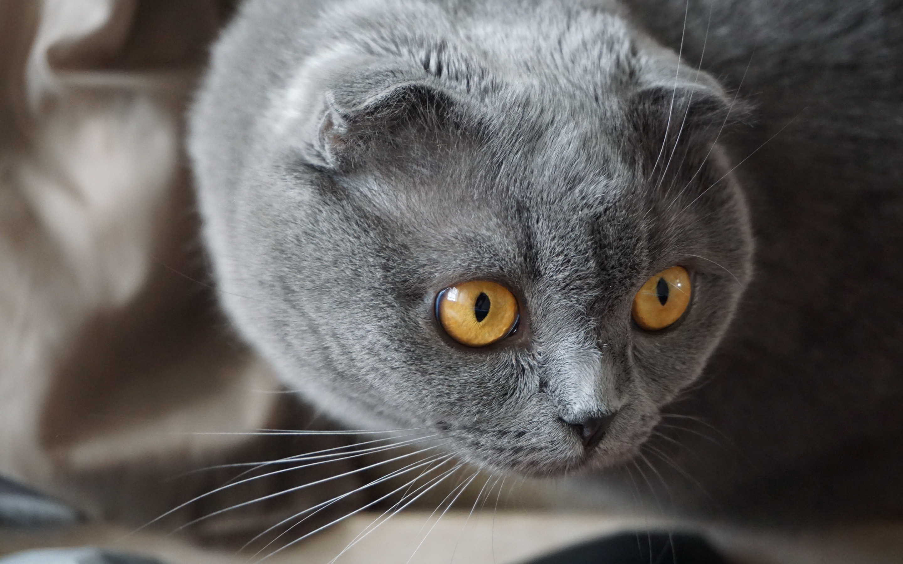 Description: A gray cat with yellow eyes is looking at the camera while laying on a bed sheet with a pillow.