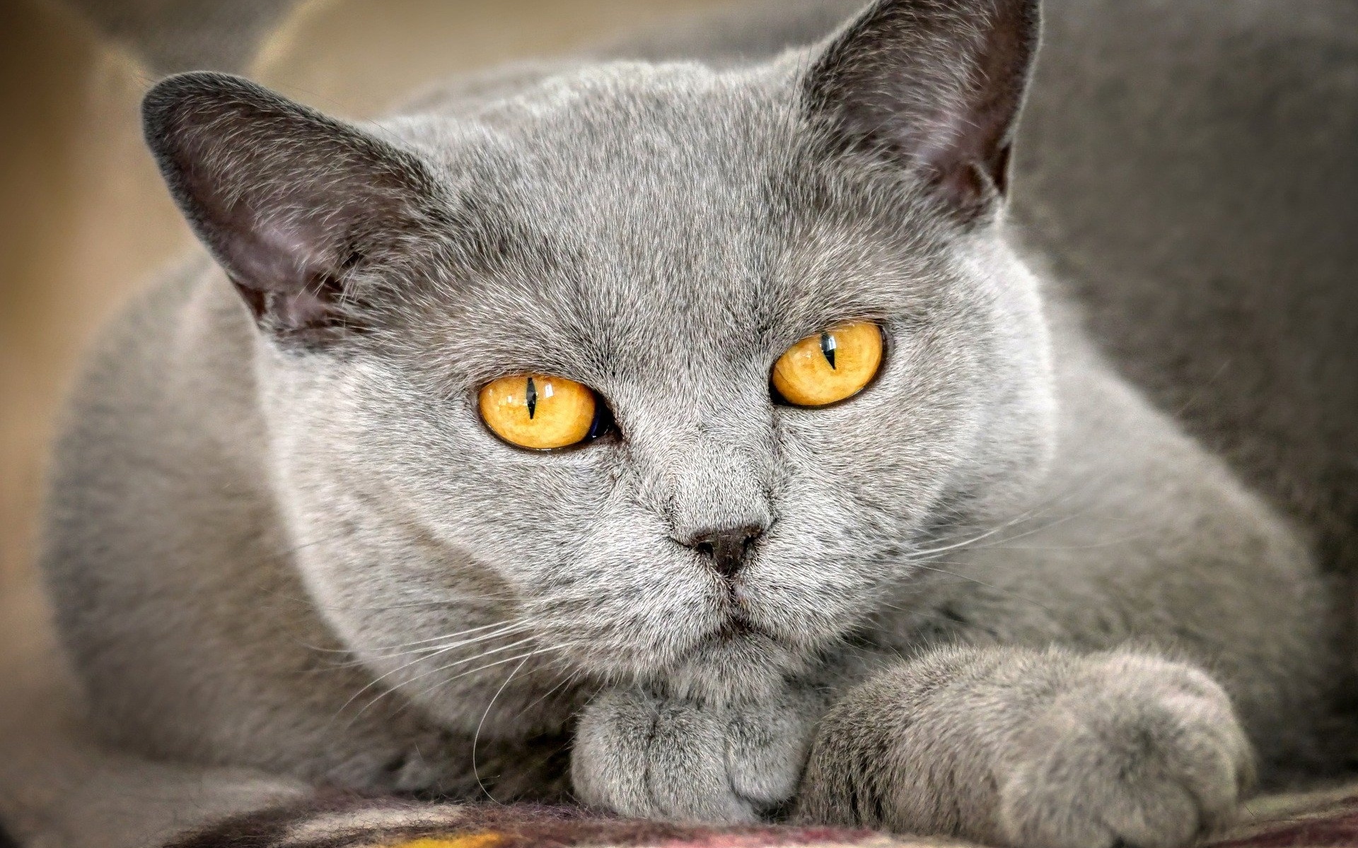 Description: A gray cat with yellow eyes laying on a blanket looking at the camera with a serious look on its face.
