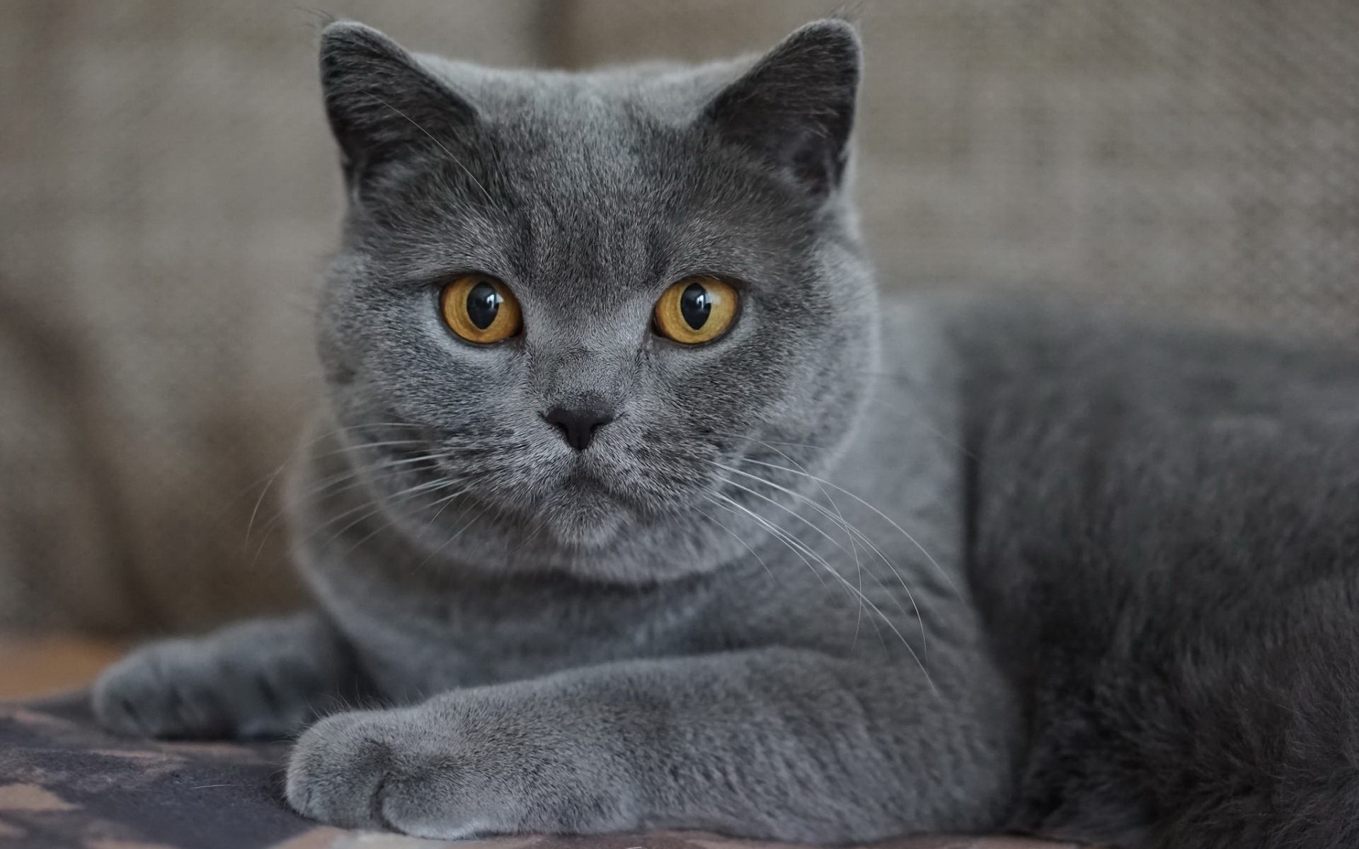 Description: A gray cat with yellow eyes laying on a couch looking at the camera with a serious look on its face.