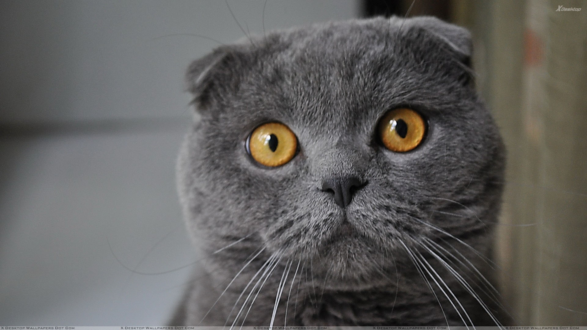 Description: A gray cat with yellow eyes looking at the camera with a serious look on its face and chest.