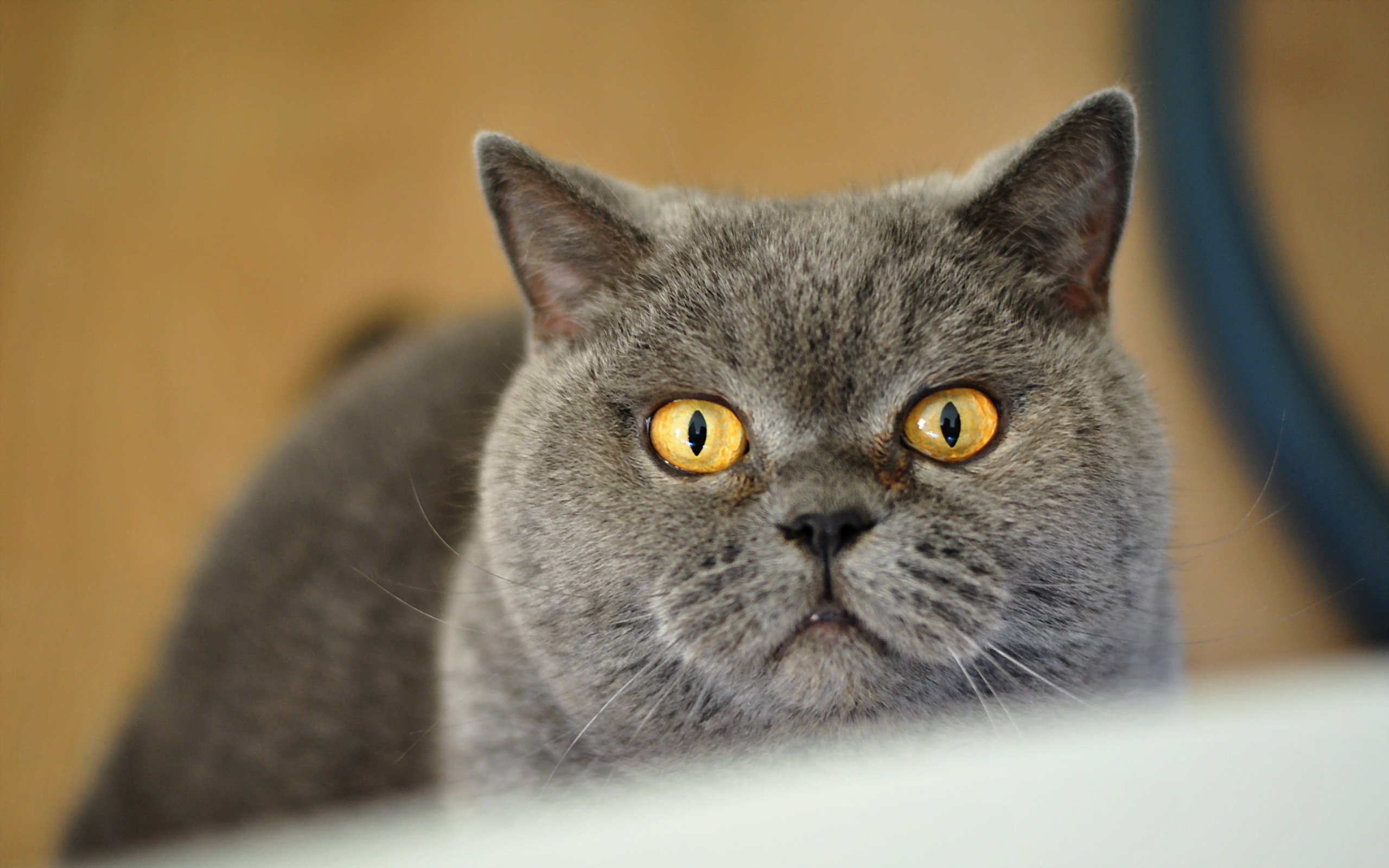 Description: A gray cat with yellow eyes looking at the camera with a surprised look on its face and a wooden wall behind it.