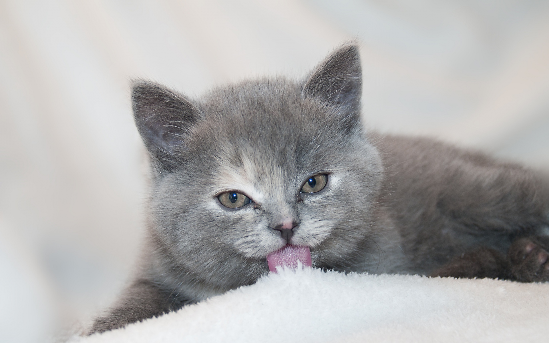 Description: A small gray kitten laying on top of a white blanket with its tongue out and tongue out.