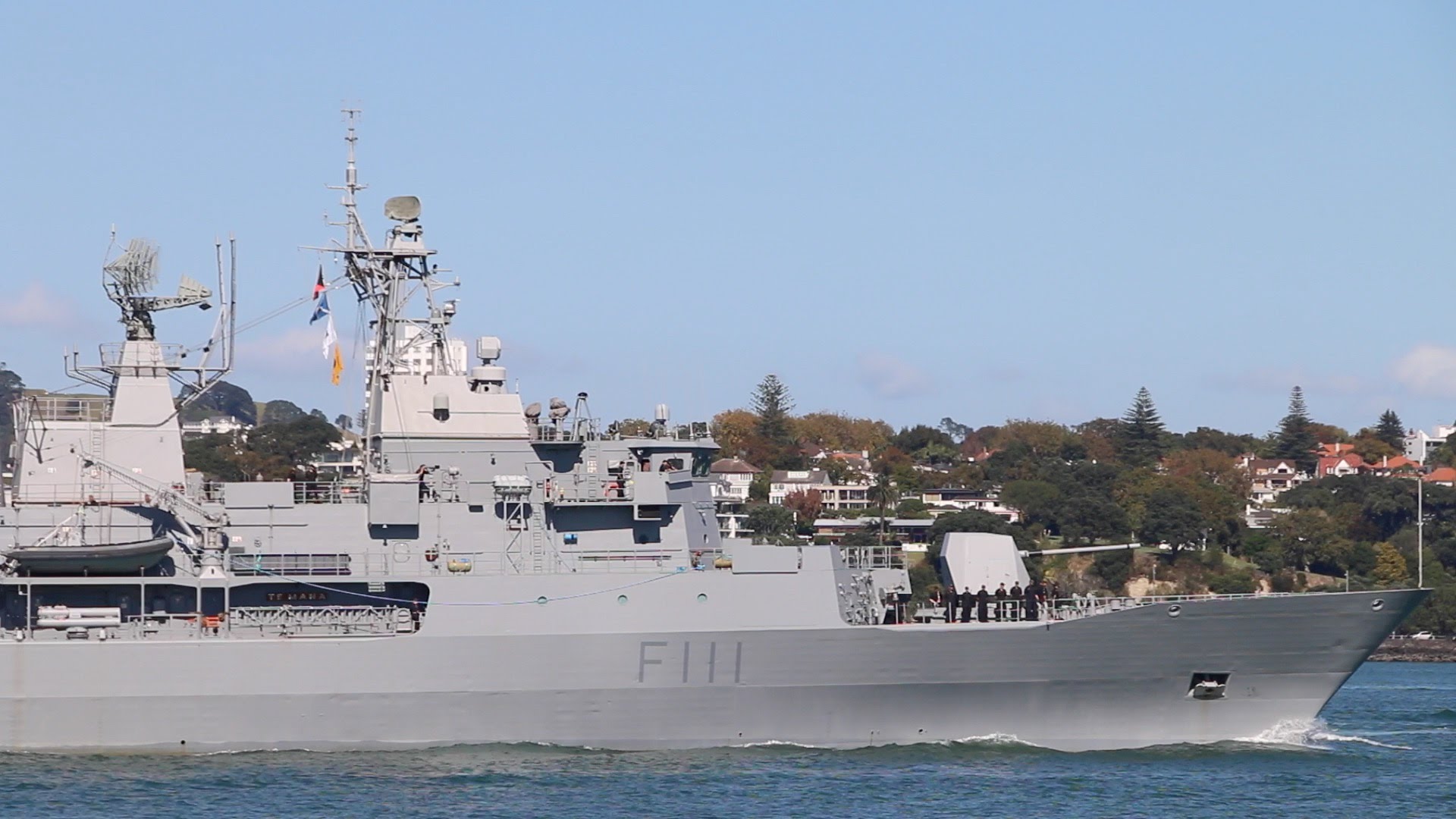 Description: A large gray ship sailing on top of a body of water next to a city skyline on a sunny day.