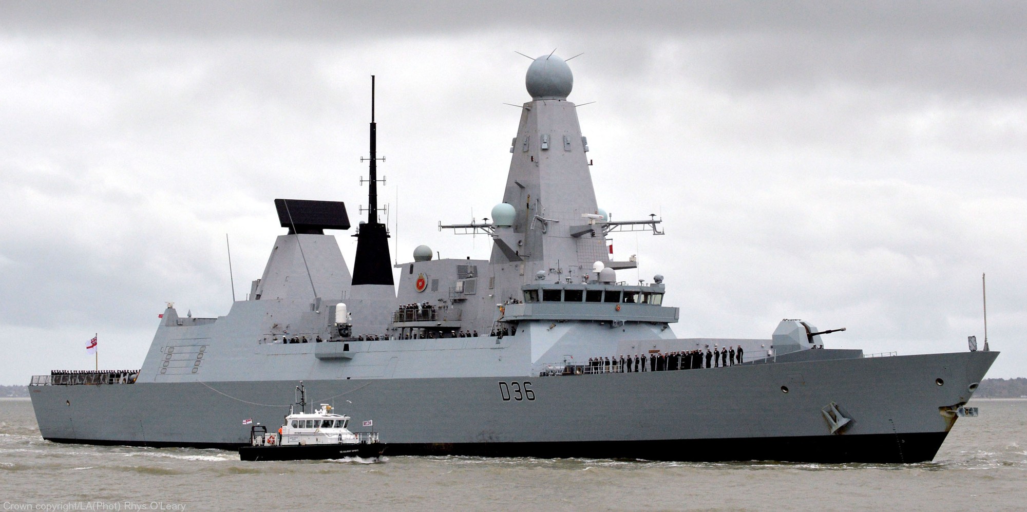 Description: A large gray ship in the water with a tug boat nearby on the water and a cloudy sky above.