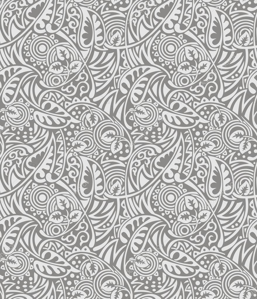 Description: A gray and white paisley pattern with swirls and dots on it.