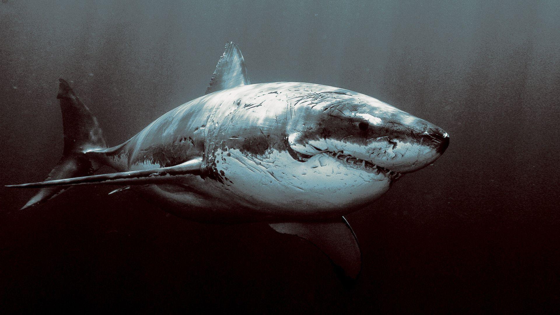 Description: A great white shark swimming in the ocean with a black background and a black background with a white shark.