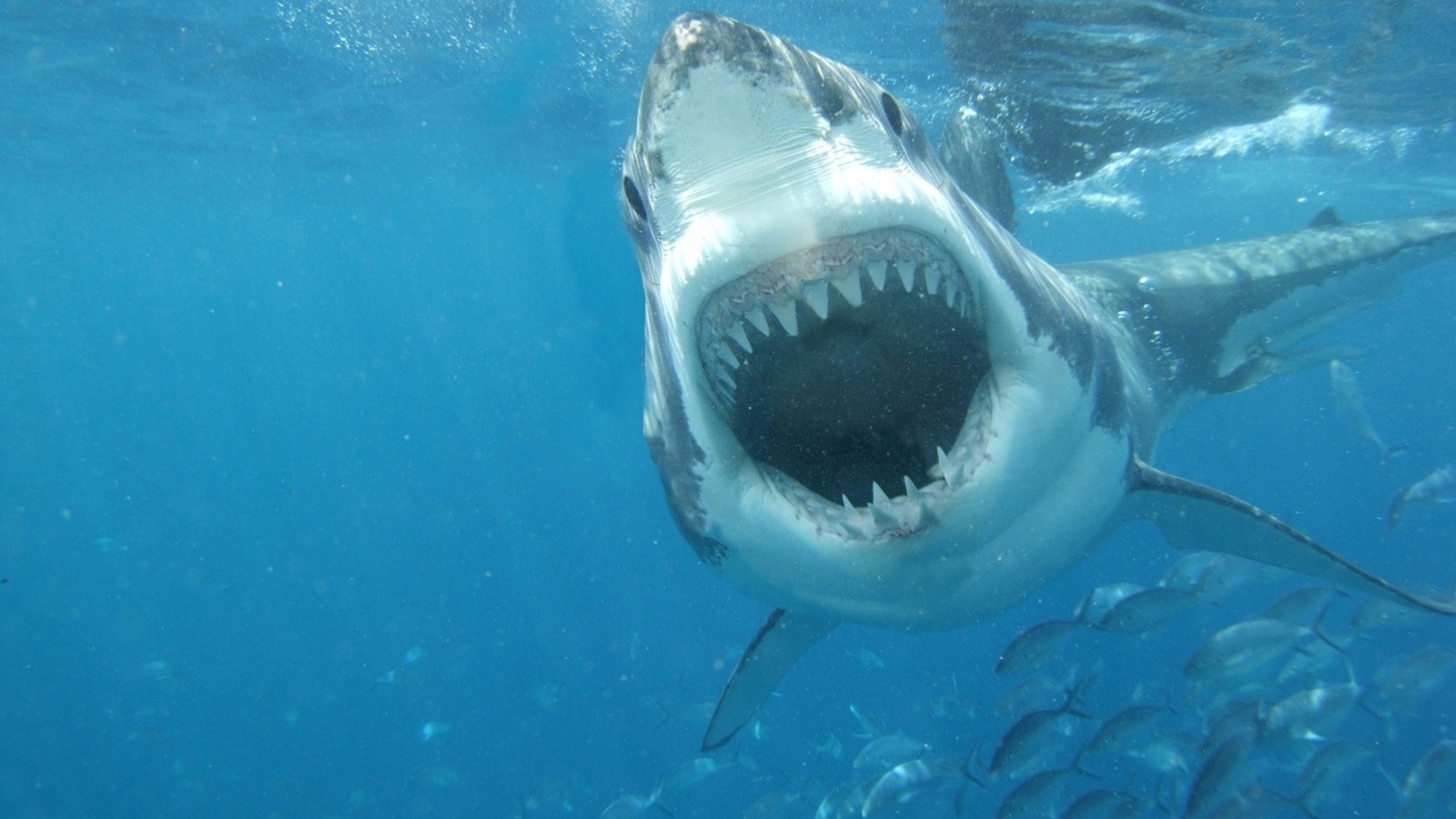 Description: A great white shark with its mouth open in the water with fish around it's sides and a man in a wet suit.