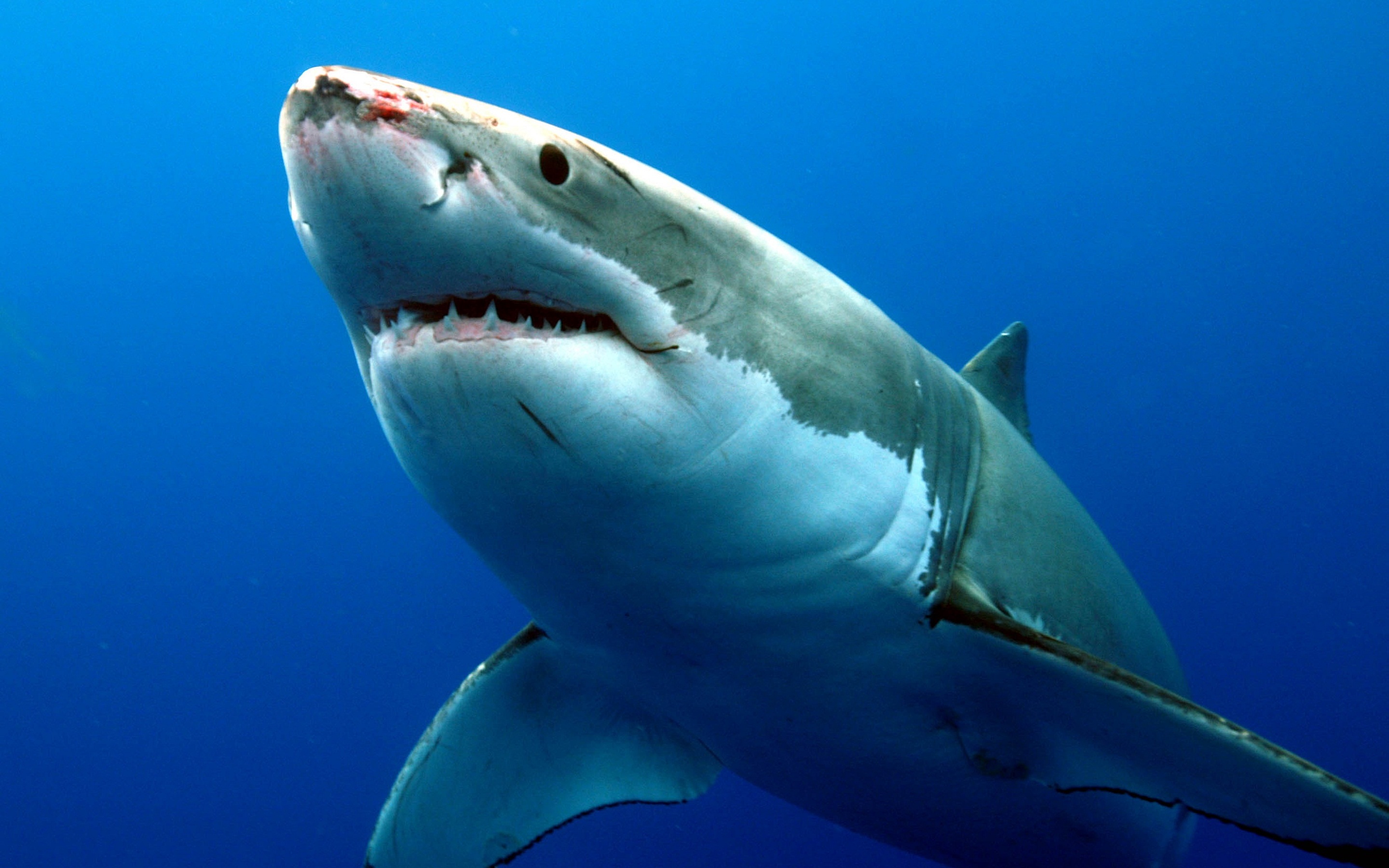 Description: A great white shark swimming in the ocean with a scuba diver nearby in the background of the photo.