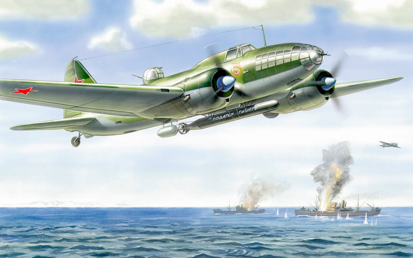 Description: A green airplane flying over a boat in the ocean with smoke coming out of it's engines and a red star on the side of the plane.