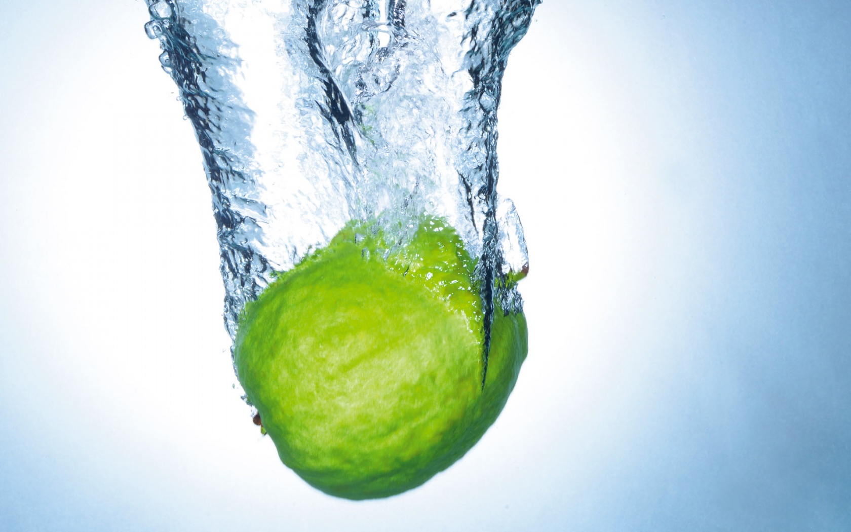Description: A green apple is in the water with a splash of water on it's side and a blue background.