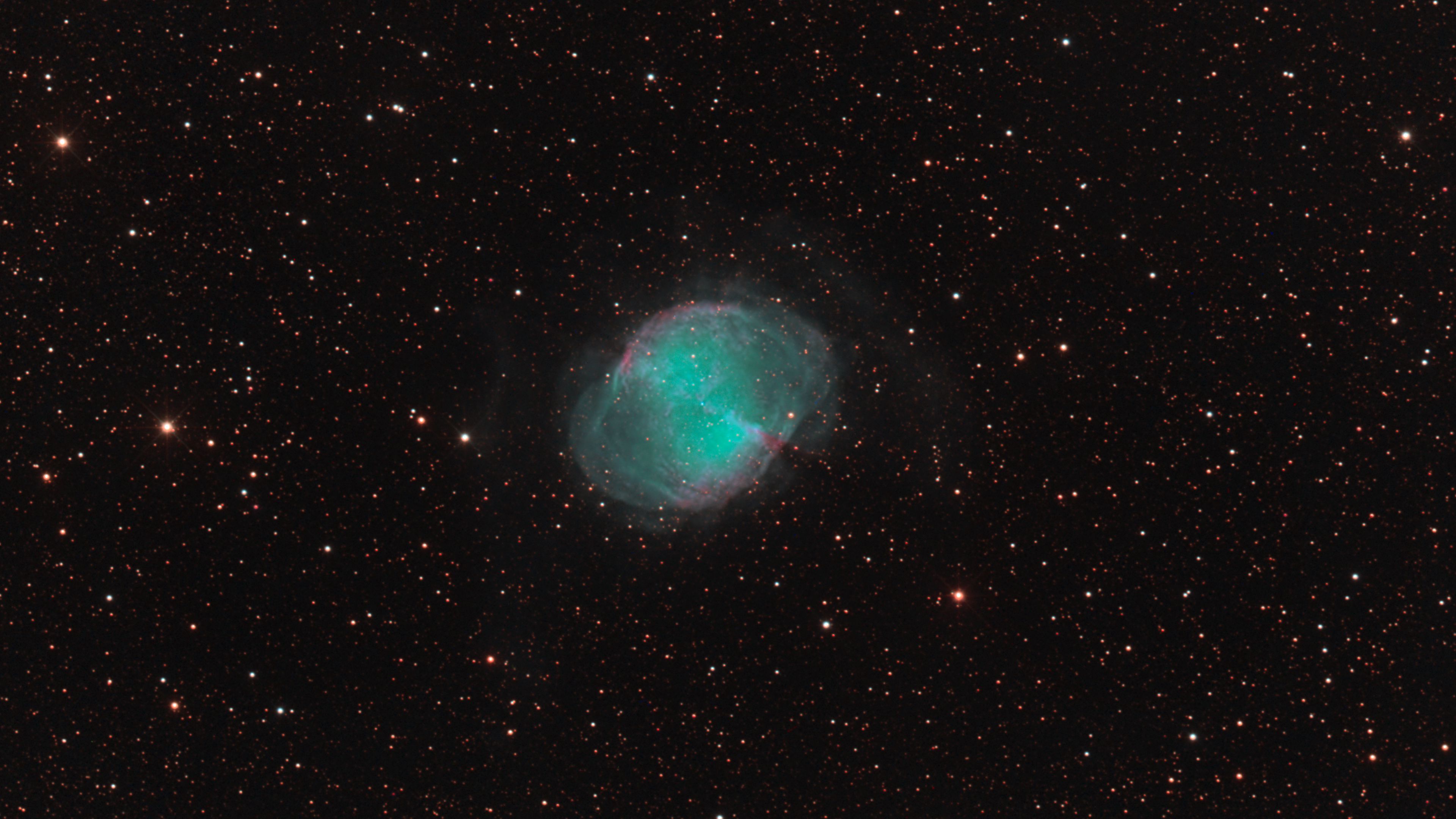 Description: A green object in the middle of a black sky filled with stars and a few other stars around it.