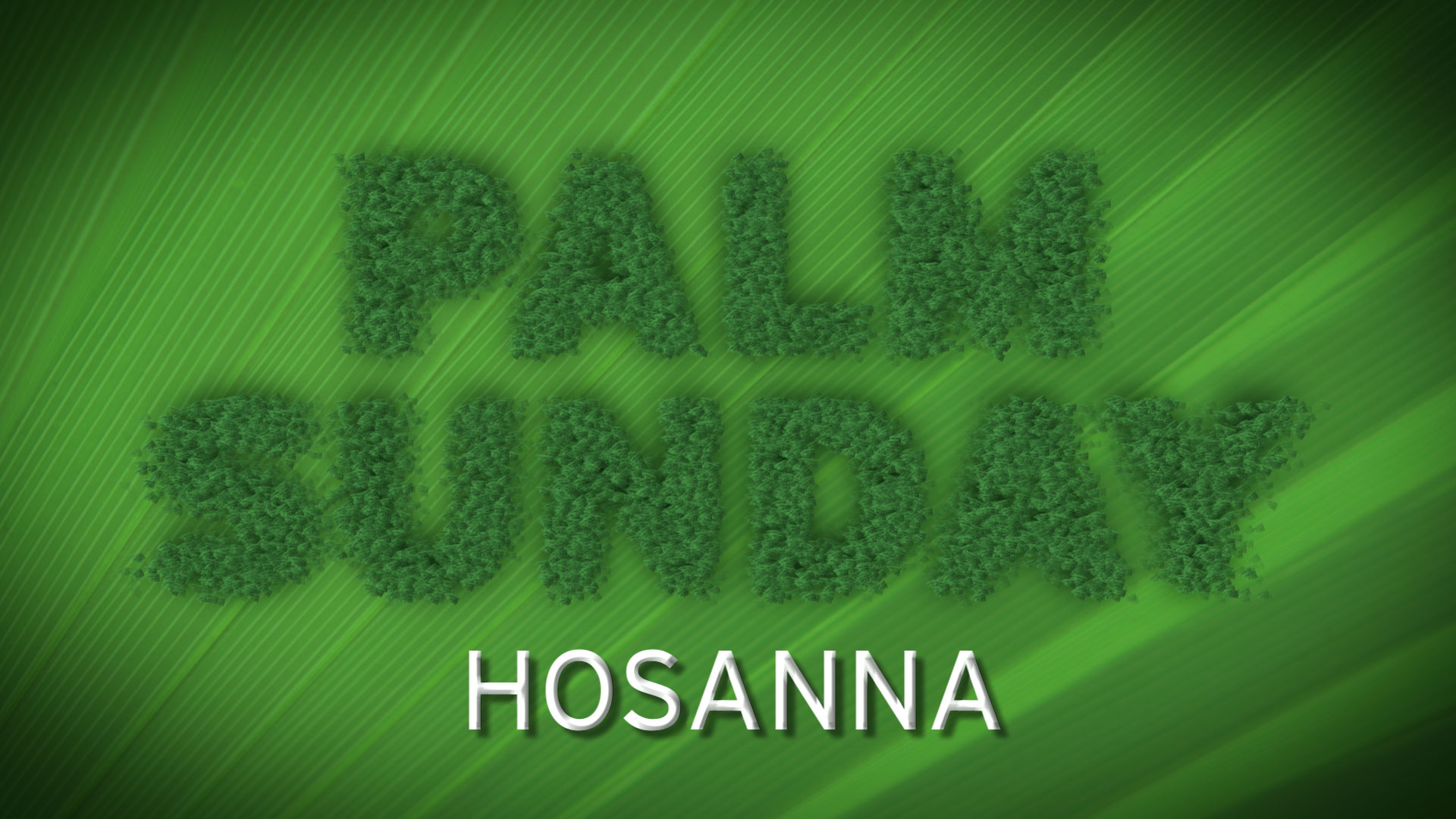 Description: A green background with the words palm sunday written in grass and the words hosanna written in white.