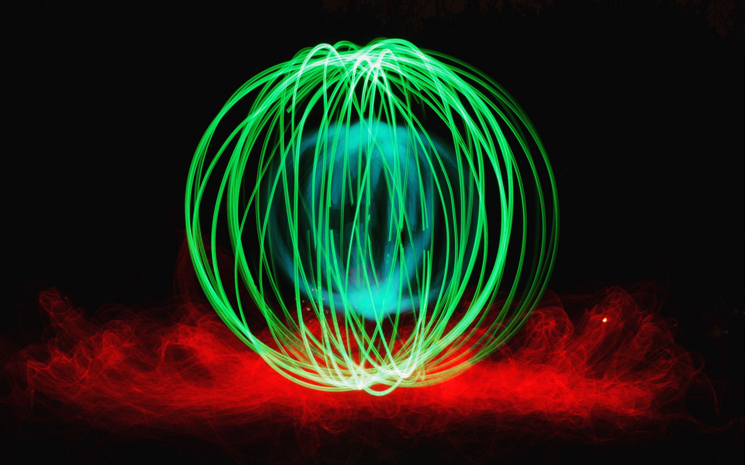 Description: A green ball with red and green lights in the dark with a black background and a red light in the middle.