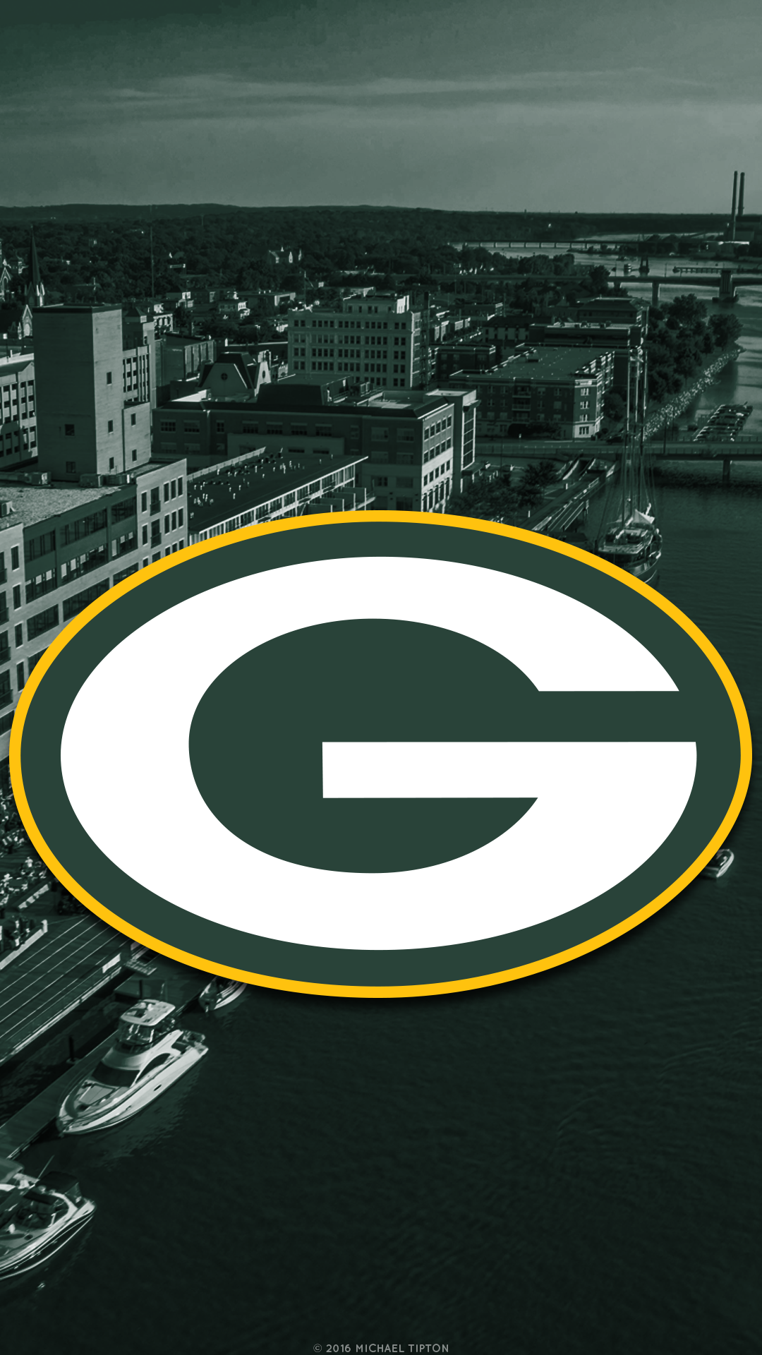 Description: A green bay packers logo is shown over a cityscape with boats in the water and a boat dock.