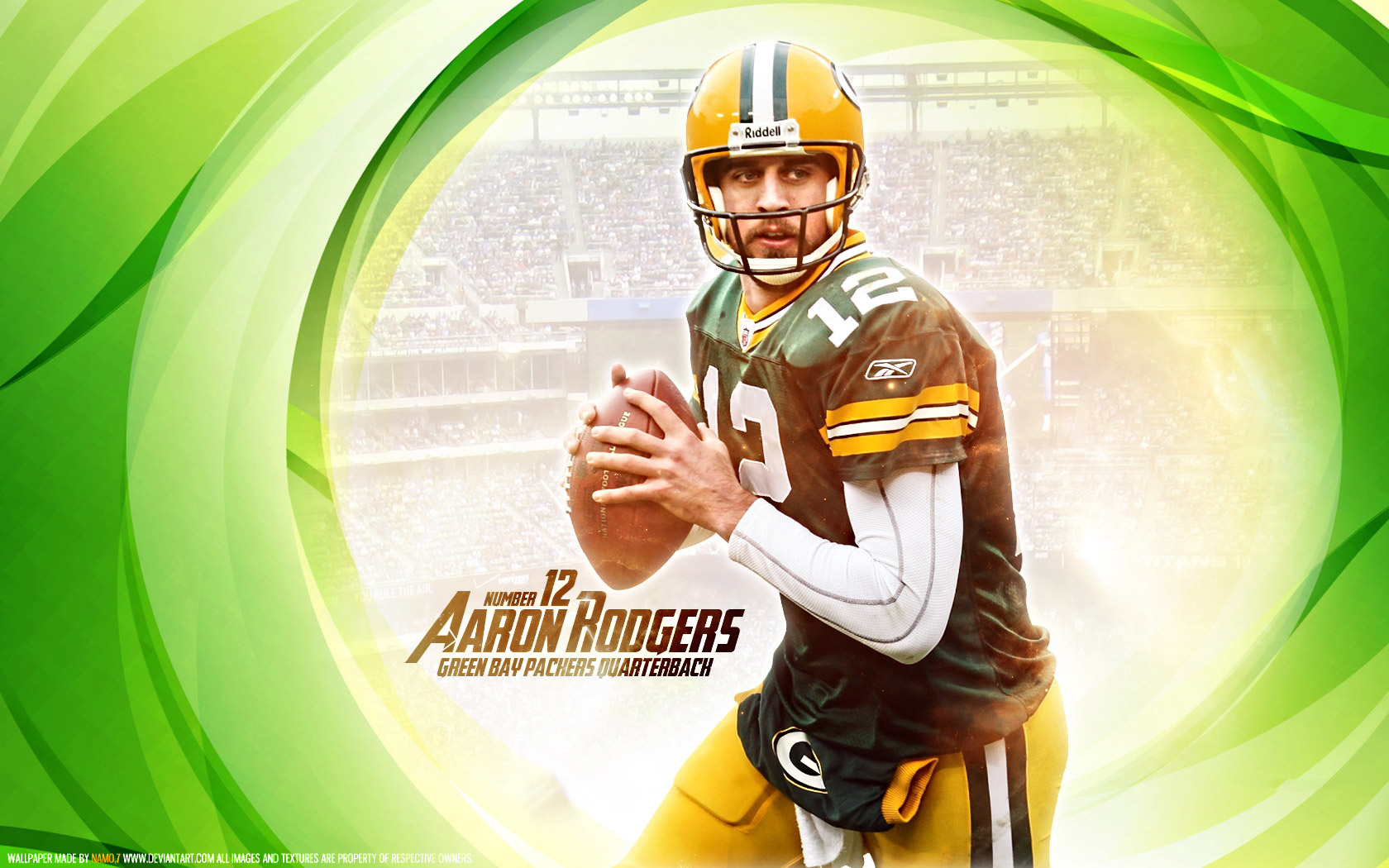 Description: A green bay packers player holding a football in his hands with a stadium in the background with a green and yellow swirl.