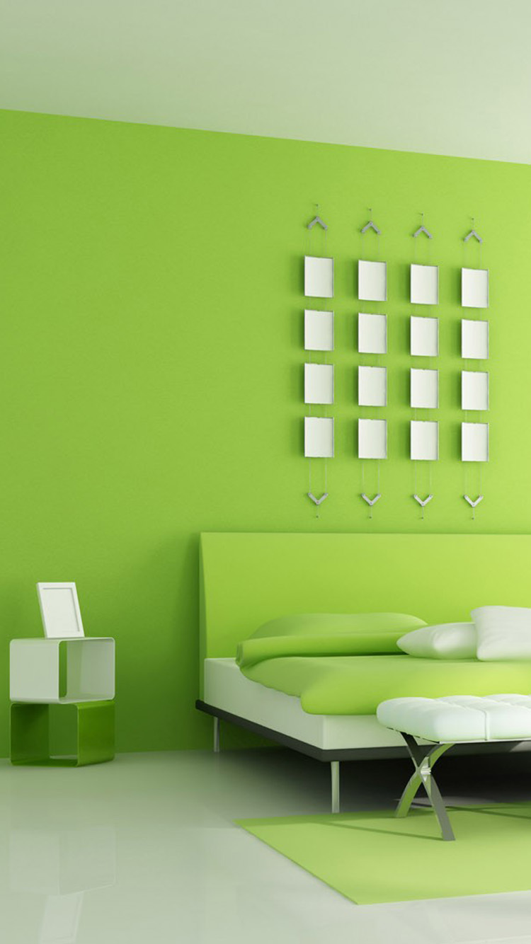 Description: A green bedroom with a white bed and a green wall with a mirror on it and a white table.