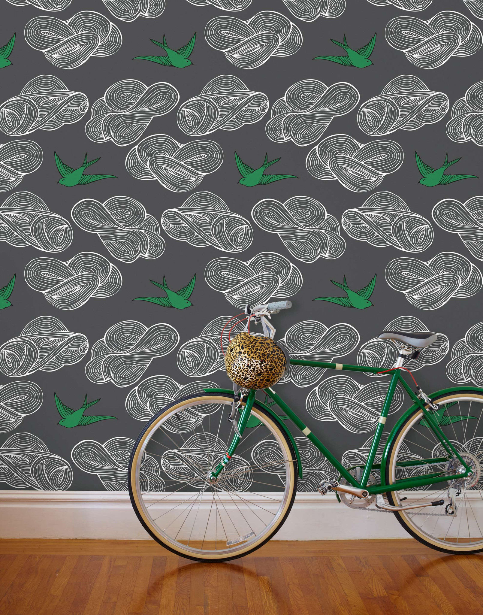Description: A green bike is parked against a wall with a green bird wallpaper behind it and a green bird wallpaper behind it.