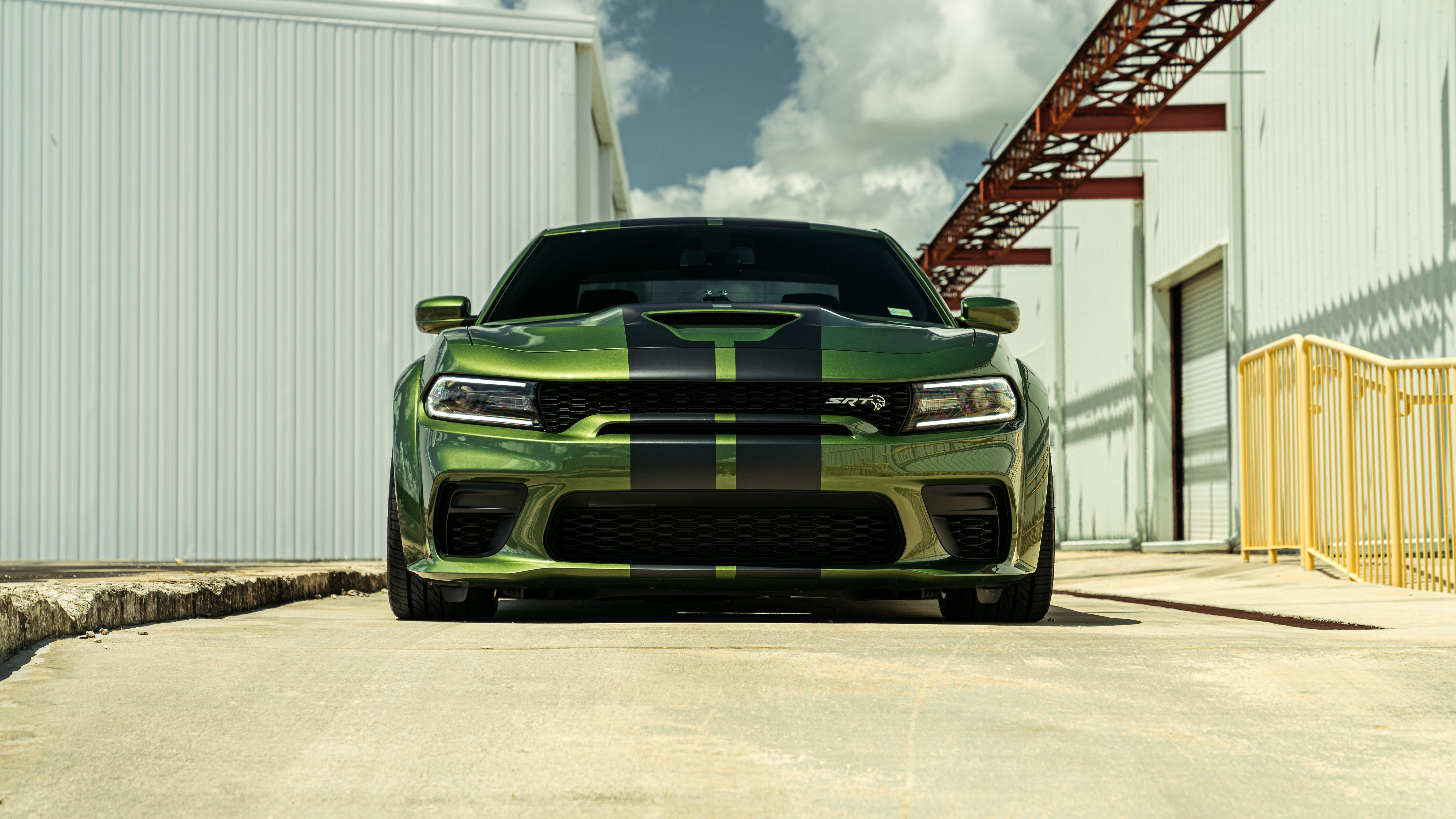 Description: A green and black car parked in front of a building with a yellow gate and a yellow gate behind it.
