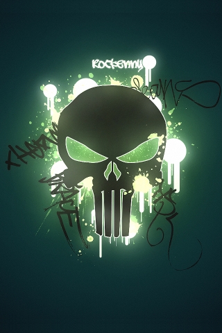 Description: A green and black wall with a skull on it's face and graffiti on the wall behind it.