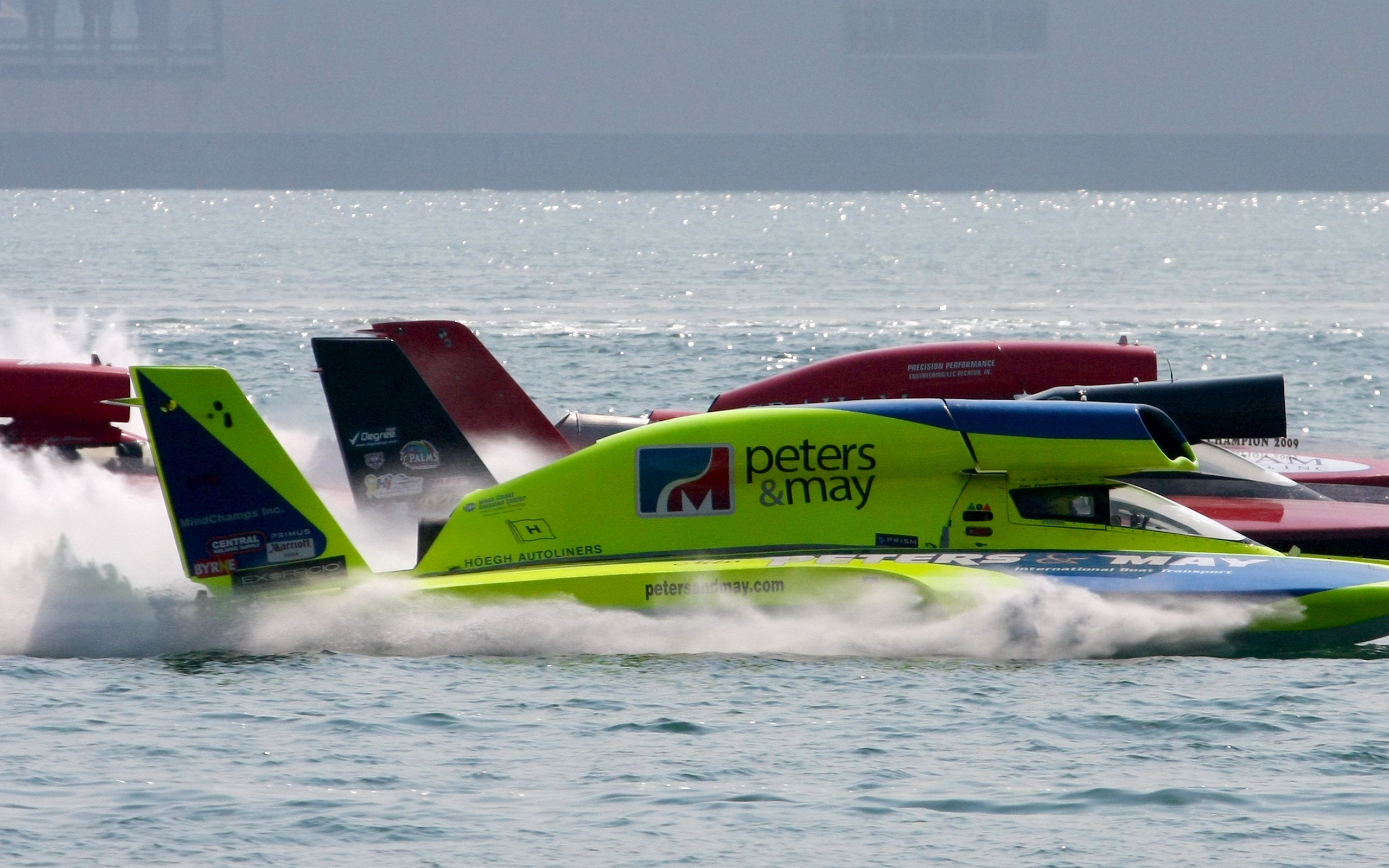 Description: A green boat with a number of red boats behind it in the water with a bridge in the background.