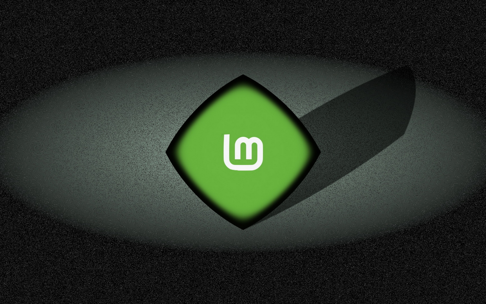 Description: A green button with a white m on it's side in the dark with a long shadow on the floor.