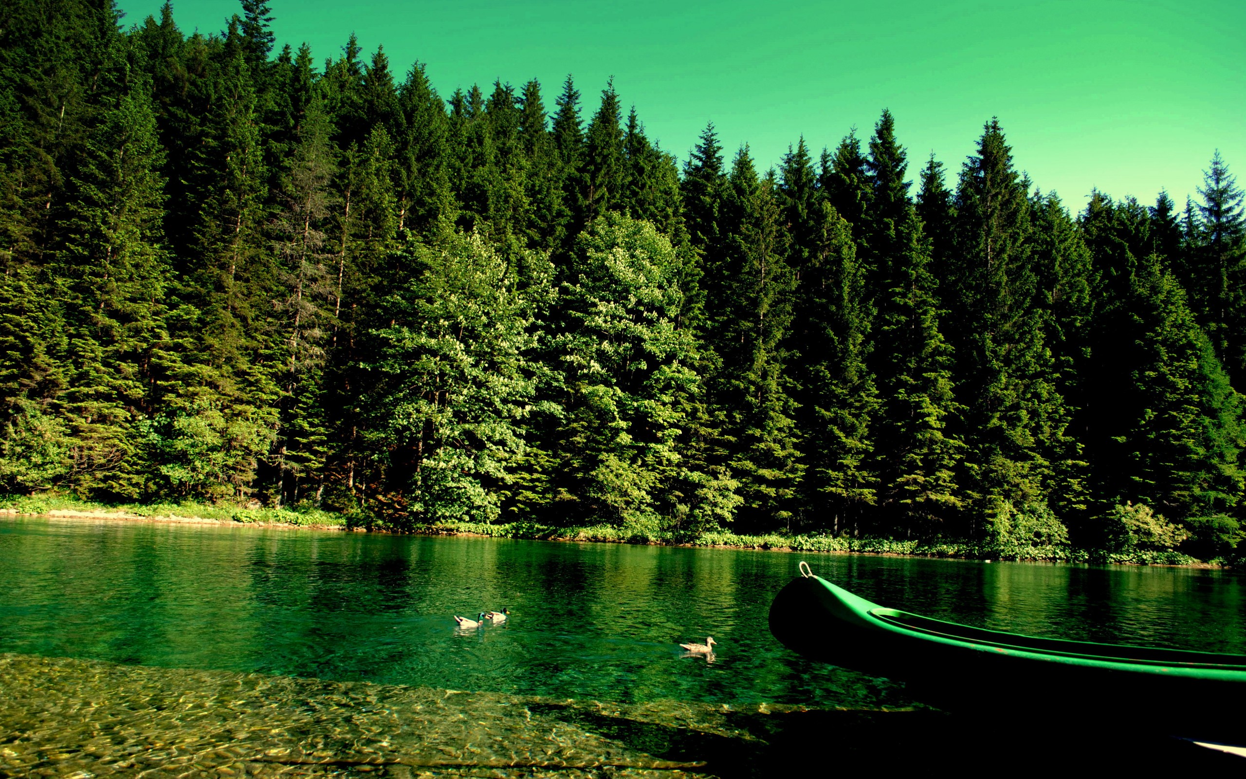 Description: A canoe is sitting on the shore of a lake near a forest with ducks swimming in it and a green canoe.